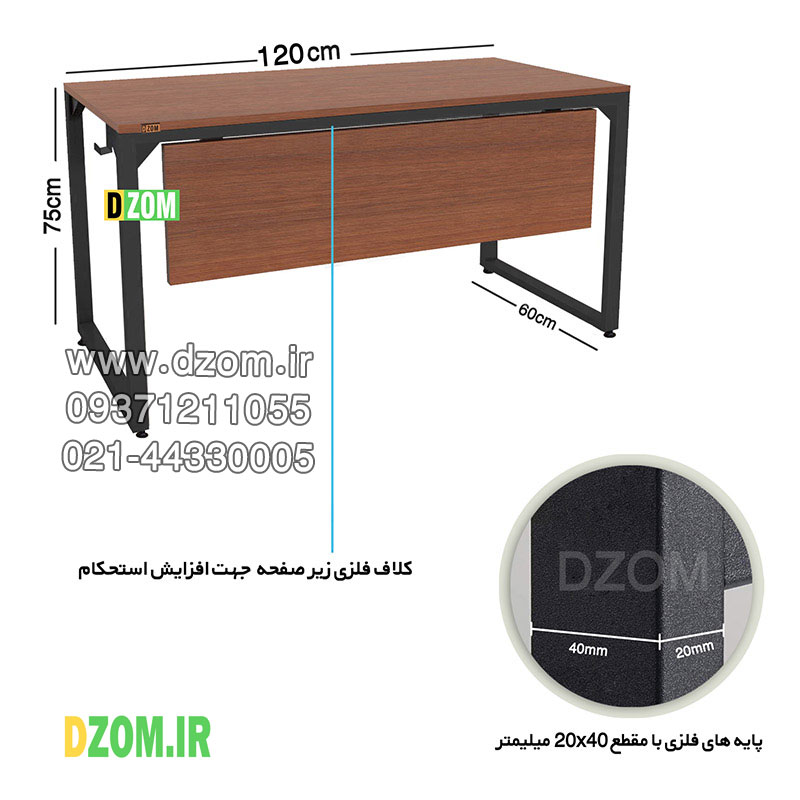 میز اداری دیزم DZOM مدل مونتاژی TLD_front_120×60_BRN محصولی مونتاژی، سبک، شیک و در عین حال جذاب و کارآمد از سری تولیدات دیزم میباشد. این محصول بصورت سلف اسمبل (مونتاژی) تولید شده است. این میز حمل و نقل آسان و هزینه حمل مقرون به صرفه ای دارد. مشتری گرامی توجه نمایید برند دیزم (شماره ثبت 414013 اداره ثبت علائم تجاری) هیچگونه نمایندگی فروش در بازارهای فیزیکی و آنلاین نداشته و محصولات خود را با کیفیت و بسته بندی اصلی، مستقیما از طریق سایت Dzom.ir یا شبکه های اجتماعی خود به مصرف کننده (End User) عرضه می نماید. لطفا از خرید کالای تقلبی از سایر فروشندگان خودداری فرمایید. این میز از پایه های فلزی با مقطع 20×40 میلیمتر و رنگ رویه الکترواستاتیک با ماندگاری و دوام بالا ساخته شده است. همچنین پایه های پیچی، قابلیت تنظیم نسبت به سطح زمین را دارد تا بهترین تراز جهت جلوگیری از تکان خوردن را ایجاد نماید. صفحه میز از جنس MDF درجه یک برجسته طرح چوب به رنگ قهوه ای می باشد. این محصول با طول 120cm، عرض 60cm و ارتفاع 75cm عرضه می شود. به این نکته توجه شود که تنوع رنگ انتخابی کالا تنها مربوط به رنگ پایه های فلزی میباشد.