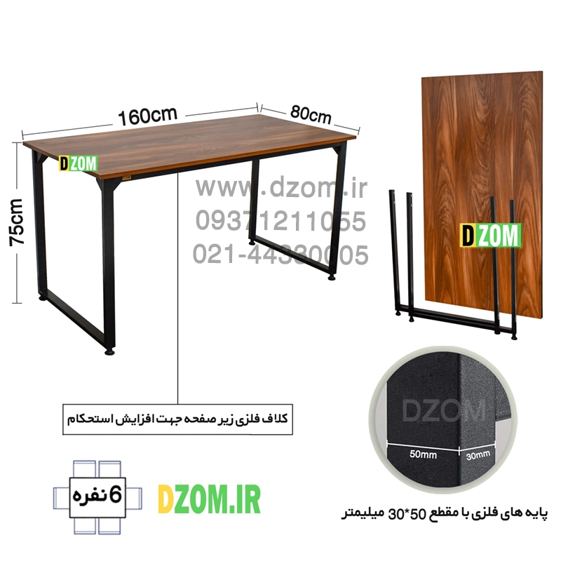 میز ناهار خوری دیزم DZom مدل مونتاژی LNC_asm_160×80_BRN محصولی مونتاژی، سبک، شیک و در عین حال جذاب و کارآمد از سری تولیدات دیزم میباشد. مشتری گرامی توجه نمایید برند دیزم (شماره ثبت 414013 اداره ثبت علائم تجاری) هیچگونه نمایندگی فروش در بازارهای فیزیکی و آنلاین نداشته و محصولات خود را با کیفیت و بسته بندی اصلی، مستقیما از طریق سایت Dzom.ir یا شبکه های اجتماعی خود به مصرف کننده (End User) عرضه می نماید. لطفا از خرید کالای تقلبی از سایر فروشندگان خودداری فرمایید. این محصول بصورت سلف اسمبل (مونتاژی) تولید شده است. این میز حمل و نقل آسان و هزینه حمل مقرون به صرفه ای دارد. این میز از پایه های فلزی با مقطع 50×30 میلیمتر و رنگ رویه الکترواستاتیک با ماندگاری و دوام بالا ساخته شده است. همچنین پایه های پیچی، قابلیت تنظیم نسبت به سطح زمین را دارد تا بهترین تراز جهت جلوگیری از تکان خوردن را ایجاد نماید. صفحه میز از جنس MDF درجه یک برجسته طرح چوب به رنگ قهوه ای می باشد. این محصول با طول 160cm، عرض 80cm و ارتفاع 75cm عرضه می شود. به این نکته توجه شود که تنوع رنگ انتخابی کالا تنها مربوط به رنگ پایه های فلزی میباشد.