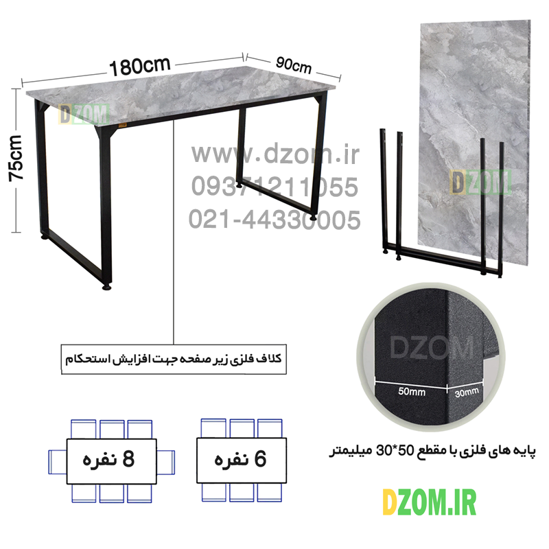 میز ناهارخوری دیزم DZom مدل مونتاژی LNC_asm_180×90_GR محصولی مونتاژی، سبک، شیک و در عین حال جذاب و کارآمد از سری تولیدات دیزم میباشد. مشتری گرامی توجه نمایید برند دیزم (شماره ثبت 414013 اداره ثبت علائم تجاری) هیچگونه نمایندگی فروش در بازارهای فیزیکی و آنلاین نداشته و محصولات خود را با کیفیت و بسته بندی اصلی، مستقیما از طریق سایت Dzom.ir یا شبکه های اجتماعی خود به مصرف کننده (End User) عرضه می نماید. لطفا از خرید کالای تقلبی از سایر فروشندگان خودداری فرمایید. این محصول بصورت سلف اسمبل (مونتاژی) تولید شده است. این میز حمل و نقل آسان و هزینه حمل مقرون به صرفه ای دارد. این میز از پایه های فلزی با مقطع 50×30 میلیمتر و رنگ رویه الکترواستاتیک با ماندگاری و دوام بالا ساخته شده است. همچنین پایه های پیچی، قابلیت تنظیم نسبت به سطح زمین را دارد تا بهترین تراز جهت جلوگیری از تکان خوردن را ایجاد نماید. صفحه میز از جنس MDF درجه یک به رنگ طوسی می باشد. این محصول با طول 180cm، عرض 90cm و ارتفاع 75cm عرضه می شود. به این نکته توجه شود که تنوع رنگ انتخابی کالا تنها مربوط به رنگ پایه های فلزی میباشد.
