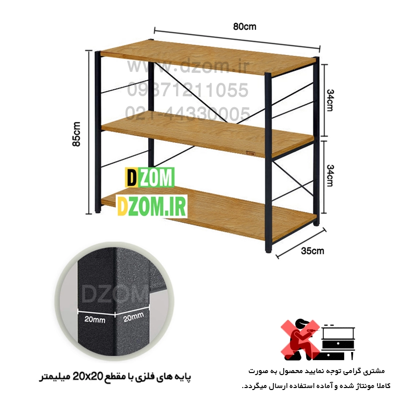 کتابخانه دیزم DZom مدل LIB-77K12-80LIGHT محصولی سبک، شیک و در عین حال جذاب و کارآمد از سری تولیدات دیزم میباشد. مشتری گرامی توجه نمایید برند دیزم هیچگونه نمایندگی فروش در بازارهای فیزیکی و آنلاین نداشته و محصولات خود را با کیفیت و بسته بندی اصلی، مستقیما از طریق سایت Dzom.ir یا شبکه های اجتماعی خود به مصرف کننده (End User) عرضه می نماید. لطفا از خرید کالای تقلبی از سایر فروشندگان خودداری فرمایید. این محصول از پایه های فلزی با مقطع 20×20 میلیمتر و رنگ رویه الکترواستاتیک با ماندگاری و دوام بالا ساخته شده است. همچنین پایه های پیچی، قابلیت تنظیم نسبت به سطح زمین را دارد تا بهترین تراز جهت جلوگیری از تکان خوردن را ایجاد نماید. صفحه محصول از جنس MDF درجه یک برجسته طرح چوب و به رنگ قهوه ای روشن می باشد. این محصول با طول 80cm، عرض 35cm و ارتفاع 85cm عرضه می شود. به این نکته توجه شود که تنوع رنگ انتخابی کالا تنها مربوط به رنگ پایه های فلزی میباشد و محصول به صورت کاملا مونتاژ شده و آماده استفاده برای مشتریان ارسال می گردد.
