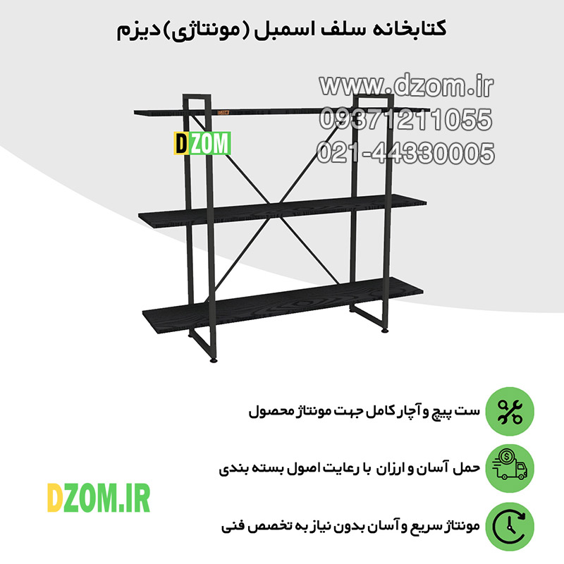 شلف ایستاده سه طبقه دیزم DZom مدل مونتاژی SLF_100×100_B محصولی مونتاژی، سبک، شیک و در عین حال جذاب و کارآمد از سری تولیدات دیزم میباشد. مشتری گرامی توجه نمایید برند دیزم (شماره ثبت 414013 اداره ثبت علائم تجاری) هیچگونه نمایندگی فروش در بازارهای فیزیکی و آنلاین نداشته و محصولات خود را با کیفیت و بسته بندی اصلی، مستقیما از طریق سایت Dzom.ir یا شبکه های اجتماعی خود به مصرف کننده (End User) عرضه می نماید. لطفا از خرید کالای تقلبی از سایر فروشندگان خودداری فرمایید. این محصول بصورت سلف اسمبل (مونتاژی) تولید شده است. این شلف حمل و نقل آسان و هزینه حمل مقرون به صرفه ای دارد. از پایه های فلزی با مقطع 20×20 میلیمتر و رنگ رویه الکترواستاتیک با ماندگاری و دوام بالا ساخته شده است. همچنین پایه های پیچی، قابلیت تنظیم نسبت به سطح زمین را دارد تا بهترین تراز جهت جلوگیری از تکان خوردن را ایجاد نماید. صفحات شلف از جنس MDF درجه یک برجسته طرح چوب به رنگ مشکی می باشد. این محصول با طول 100cm، عرض 30cm و ارتفاع 100cm عرضه می شود. به این نکته توجه شود که تنوع رنگ انتخابی کالا تنها مربوط به رنگ پایه های فلزی میباشد.