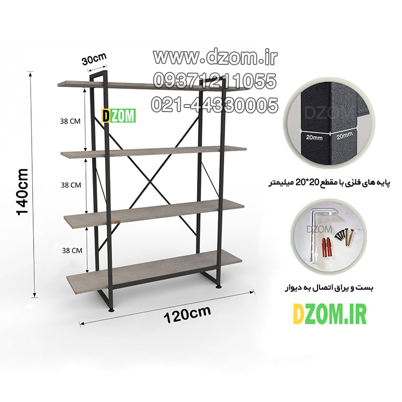 شلف ایستاده دیزم DZom مدل مونتاژی SLF_120×140_GR محصولی مونتاژی، سبک، شیک و در عین حال جذاب و کارآمد از سری تولیدات دیزم میباشد. مشتری گرامی توجه نمایید برند دیزم (شماره ثبت 414013 اداره ثبت علائم تجاری) هیچگونه نمایندگی فروش در بازارهای فیزیکی و آنلاین نداشته و محصولات خود را با کیفیت و بسته بندی اصلی، مستقیما از طریق سایت Dzom.ir یا شبکه های اجتماعی خود به مصرف کننده (End User) عرضه می نماید. لطفا از خرید کالای تقلبی از سایر فروشندگان خودداری فرمایید. این محصول بصورت سلف اسمبل (مونتاژی) تولید شده است. این شلف حمل و نقل آسان و هزینه حمل مقرون به صرفه ای دارد. از پایه های فلزی با مقطع 20×20 میلیمتر و رنگ رویه الکترواستاتیک با ماندگاری و دوام بالا ساخته شده است. همچنین پایه های پیچی، قابلیت تنظیم نسبت به سطح زمین را دارد تا بهترین تراز جهت جلوگیری از تکان خوردن را ایجاد نماید. صفحات شلف از جنس MDF درجه یک به رنگ طوسی می باشد. این محصول با طول 120cm، عرض 30cm و ارتفاع 140cm عرضه می شود. به این نکته توجه شود که تنوع رنگ انتخابی کالا تنها مربوط به رنگ پایه های فلزی میباشد. توصیه میشود جهت حفظ ایمنی و ثبات بیشتر، محصول در یک یا دو نقطه به دیوار پیچ گردد.(یراق اتصال داخل بسته بندی موجود است).