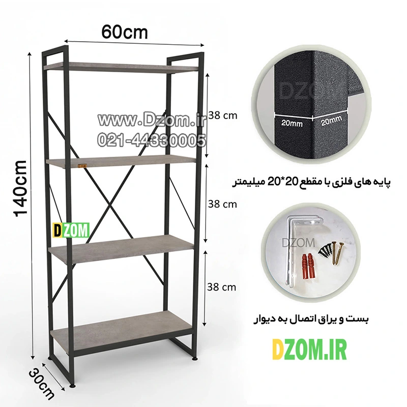 شلف ایستاده دیزم DZom مدل مونتاژی SLF_60×140_GR محصولی مونتاژی، سبک، شیک و در عین حال جذاب و کارآمد از سری تولیدات دیزم میباشد. مشتری گرامی توجه نمایید برند دیزم (شماره ثبت 414013 اداره ثبت علائم تجاری) هیچگونه نمایندگی فروش در بازارهای فیزیکی و آنلاین نداشته و محصولات خود را با کیفیت و بسته بندی اصلی، مستقیما از طریق سایت Dzom.ir یا شبکه های اجتماعی خود به مصرف کننده (End User) عرضه می نماید. لطفا از خرید کالای تقلبی از سایر فروشندگان خودداری فرمایید. این محصول بصورت سلف اسمبل (مونتاژی) تولید شده است. این شلف حمل و نقل آسان و هزینه حمل مقرون به صرفه ای دارد. از پایه های فلزی با مقطع 20×20 میلیمتر و رنگ رویه الکترواستاتیک با ماندگاری و دوام بالا ساخته شده است. همچنین پایه های پیچی، قابلیت تنظیم نسبت به سطح زمین را دارد تا بهترین تراز جهت جلوگیری از تکان خوردن را ایجاد نماید. صفحات شلف از جنس MDF درجه یک به رنگ طوسی می باشد. این محصول با طول 60cm، عرض 30cm و ارتفاع 140cm عرضه می شود. به این نکته توجه شود که تنوع رنگ انتخابی کالا تنها مربوط به رنگ پایه های فلزی میباشد. توصیه میشود جهت حفظ ایمنی و ثبات بیشتر، محصول در یک یا دو نقطه به دیوار پیچ گردد.(یراق اتصال داخل بسته بندی موجود است).