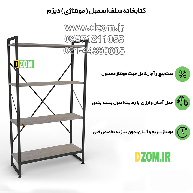 شلف ایستاده دیزم DZom مدل مونتاژی SLF_80×140_GR محصولی مونتاژی، سبک، شیک و در عین حال جذاب و کارآمد از سری تولیدات دیزم میباشد. مشتری گرامی توجه نمایید برند دیزم (شماره ثبت 414013 اداره ثبت علائم تجاری) هیچگونه نمایندگی فروش در بازارهای فیزیکی و آنلاین نداشته و محصولات خود را با کیفیت و بسته بندی اصلی، مستقیما از طریق سایت Dzom.ir یا شبکه های اجتماعی خود به مصرف کننده (End User) عرضه می نماید. لطفا از خرید کالای تقلبی از سایر فروشندگان خودداری فرمایید. این محصول بصورت سلف اسمبل (مونتاژی) تولید شده است. این شلف حمل و نقل آسان و هزینه حمل مقرون به صرفه ای دارد. از پایه های فلزی با مقطع 20×20 میلیمتر و رنگ رویه الکترواستاتیک با ماندگاری و دوام بالا ساخته شده است. همچنین پایه های پیچی، قابلیت تنظیم نسبت به سطح زمین را دارد تا بهترین تراز جهت جلوگیری از تکان خوردن را ایجاد نماید. صفحات شلف از جنس MDF درجه یک به رنگ طوسی می باشد. این محصول با طول 80cm، عرض 30cm و ارتفاع 140cm عرضه می شود. به این نکته توجه شود که تنوع رنگ انتخابی کالا تنها مربوط به رنگ پایه های فلزی میباشد. توصیه میشود جهت حفظ ایمنی و ثبات بیشتر، محصول در یک یا دو نقطه به دیوار پیچ گردد.(یراق اتصال داخل بسته بندی موجود است).