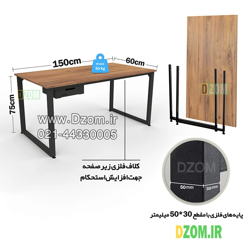میز اداری دیزم DZom مدل مونتاژی TLD_dwr_150×60 محصولی مونتاژی، سبک، شیک و در عین حال جذاب و کارآمد از سری تولیدات دیزم می‌ باشد. این محصول به‌ صورت سلف‌اسمبل (مونتاژی) تولید شده است. مشتری گرامی توجه نمایید برند دیزم (شماره ثبت 414013 اداره ثبت علائم تجاری) هیچگونه نمایندگی فروش در بازارهای فیزیکی و آنلاین نداشته و محصولات خود را با کیفیت و بسته بندی اصلی، مستقیما از طریق سایت Dzom.ir یا شبکه های اجتماعی خود به مصرف کننده (End User) عرضه می نماید. لطفا از خرید کالای تقلبی از سایر فروشندگان خودداری فرمایید. این میز پایه فلزی، مناسب استفاده برای مطالعه، تحریر، امور کارشناسی، اداری، مدیریتی، کار با کامپیوتر، فعالیت‌ های کارمندی، کنفرانس، جلسه و کارگروهی می‌باشد. حمل‌ و نقل این محصول آسان بوده و هزینه حمل آن مقرون‌ به‌ صرفه است. همچنین پایه‌ های فلزی با مقطع 50×30 میلی‌ متر و رنگ رویه کوره‌ای الکترواستاتیک با ماندگاری و دوام بالا برای این محصول به‌ کار رفته است. پایه‌ های پیچی نیز قابلیت تنظیم نسبت به سطح زمین را دارند تا بهترین تراز را جهت جلوگیری از تکان خوردن ایجاد نمایند. صفحه میز از جنس MDF درجه یک می‌ باشد. یک عدد کشوی تمام فلزی با ریل ساچمه‌ ای سه‌ مرحله‌ ای، قابل نصب در هر دو سمت میز، برای این محصول در نظر گرفته شده است. این محصول با طول 150cm، عرض 60cm و ارتفاع 75cm عرضه می‌شود. به این نکته توجه شود که تنوع رنگ انتخابی کالا تنها مربوط به رنگ MDF می باشد