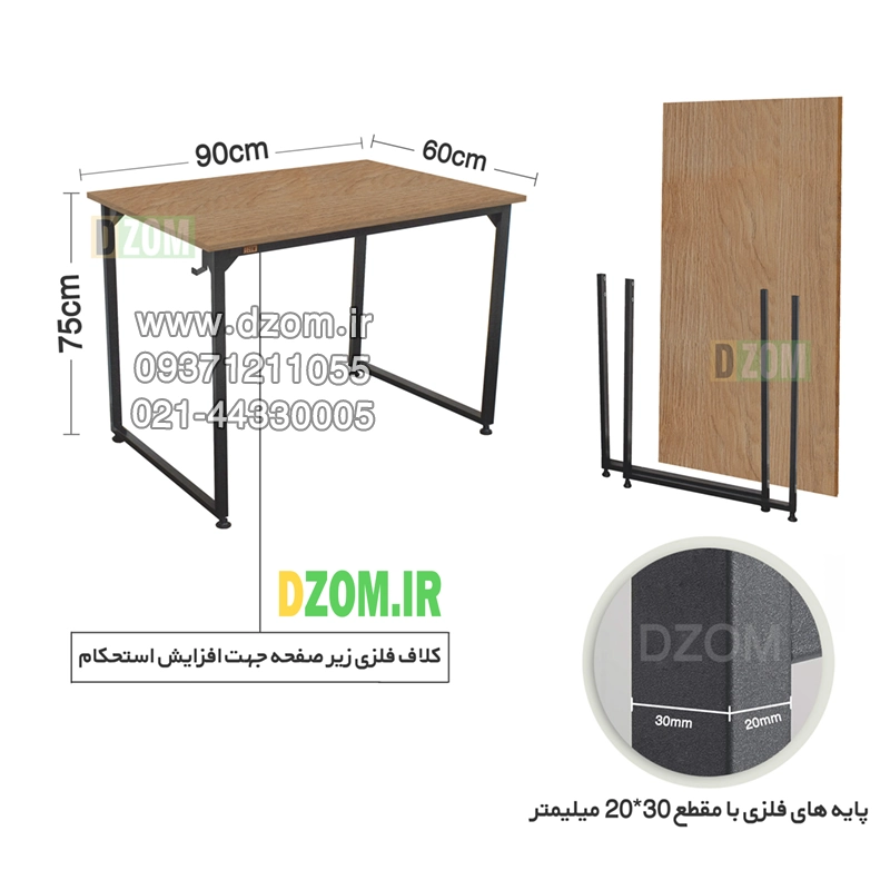 میز تحریر دیزم DZom مدل مونتاژی WD_asm_90×60_LIGHT محصولی مونتاژی، سبک، شیک و در عین حال جذاب و کارآمد از سری تولیدات دیزم میباشد. مشتری گرامی توجه نمایید برند دیزم (شماره ثبت 414013 اداره ثبت علائم تجاری) هیچگونه نمایندگی فروش در بازارهای فیزیکی و آنلاین نداشته و محصولات خود را با کیفیت و بسته بندی اصلی، مستقیما از طریق سایت Dzom.ir یا شبکه های اجتماعی خود به مصرف کننده (End User) عرضه می نماید. لطفا از خرید کالای تقلبی از سایر فروشندگان خودداری فرمایید. این محصول بصورت سلف اسمبل (مونتاژی) تولید شده است. این میز حمل و نقل آسان و هزینه حمل مقرون به صرفه ای دارد. این میز از پایه های فلزی با مقطع 30×20 میلیمتر و رنگ رویه الکترواستاتیک با ماندگاری و دوام بالا ساخته شده است. همچنین پایه های پیچی، قابلیت تنظیم نسبت به سطح زمین را دارد تا بهترین تراز جهت جلوگیری از تکان خوردن را ایجاد نماید. صفحه میز از جنس MDF درجه یک برجسته طرح چوب و به رنگ قهوه ای روشن می باشد. این محصول با طول 90cm، عرض 60cm و ارتفاع 75cm عرضه می شود. به این نکته توجه شود که تنوع رنگ انتخابی کالا تنها مربوط به رنگ پایه های فلزی میباشد.