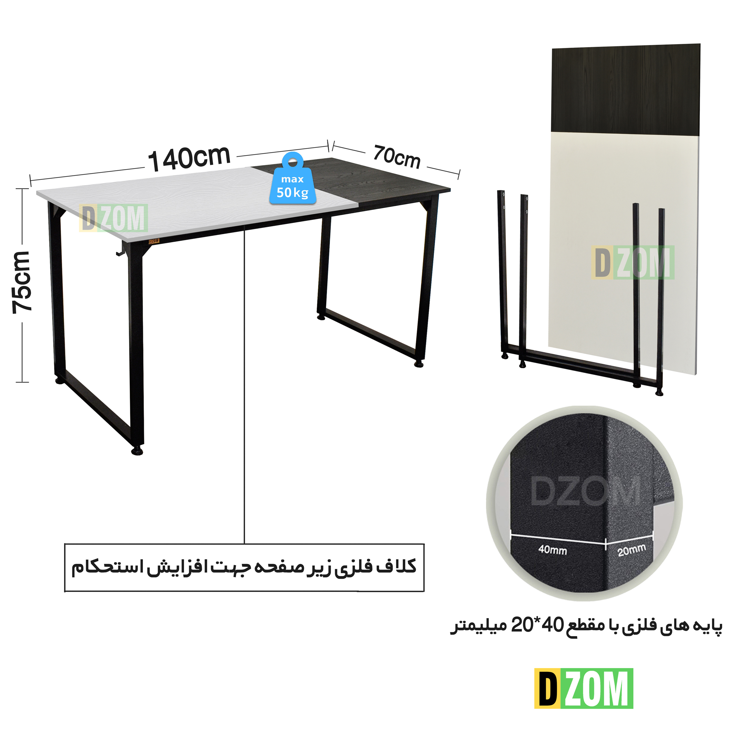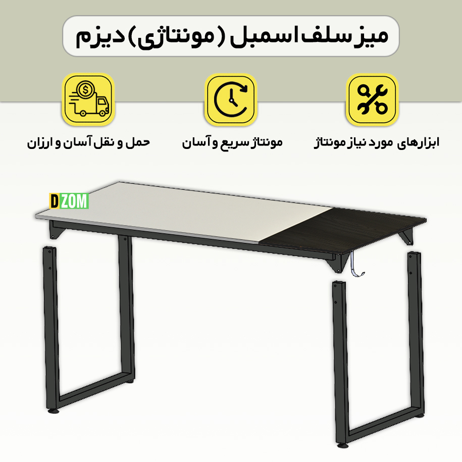میز تحریر دیزم DZom مدل مونتاژی WD_asm_140×70_Di_BAW محصولی مونتاژی، سبک، شیک و در عین حال جذاب و کارآمد از سری تولیدات دیزم میباشد. این محصول بصورت سلف اسمبل (مونتاژی) تولید شده است. این میز حمل و نقل آسان و هزینه حمل مقرون به صرفه ای دارد. مشتری گرامی توجه نمایید برند دیزم (شماره ثبت 414013 اداره ثبت علائم تجاری) هیچگونه نمایندگی فروش در بازارهای فیزیکی و آنلاین نداشته و محصولات خود را با کیفیت و بسته بندی اصلی، مستقیما از طریق سایت Dzom.ir یا شبکه های اجتماعی خود به مصرف کننده (End User) عرضه می نماید. لطفا از خرید کالای تقلبی از سایر فروشندگان خودداری فرمایید. این میز از پایه های فلزی با مقطع 40×20 میلیمتر و رنگ رویه الکترواستاتیک با ماندگاری و دوام بالا ساخته شده است. همچنین پایه های پیچی، قابلیت تنظیم نسبت به سطح زمین را دارد تا بهترین تراز جهت جلوگیری از تکان خوردن را ایجاد نماید. صفحه میز از جنس MDF درجه یک برجسته طرح چوب و ترکیبی از دو رنگ مشکی و سفید می باشد. این محصول با طول 140cm، عرض 70cm و ارتفاع 75cm عرضه می شود. به این نکته توجه شود که تنوع رنگ انتخابی کالا تنها مربوط به رنگ پایه های فلزی میباشد.