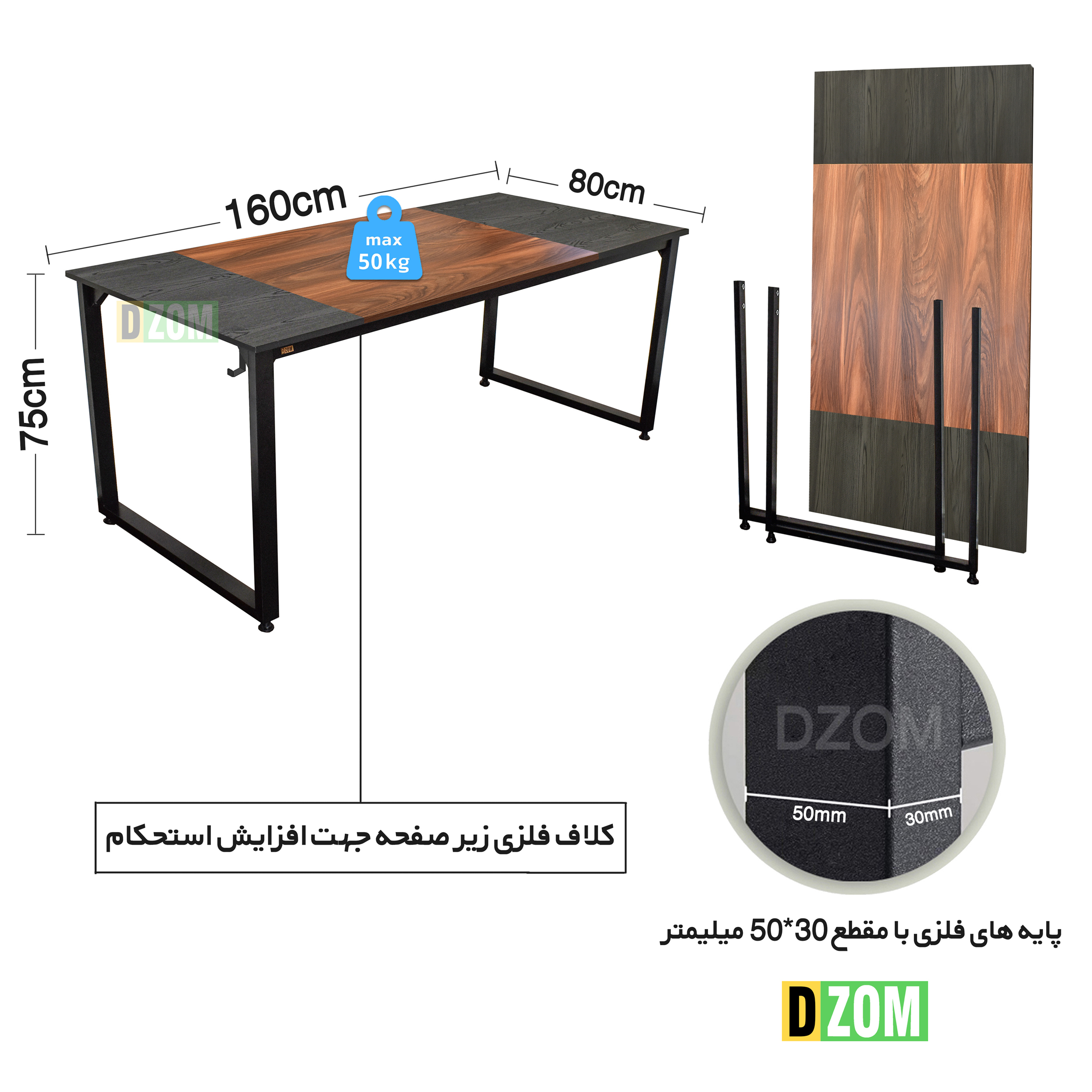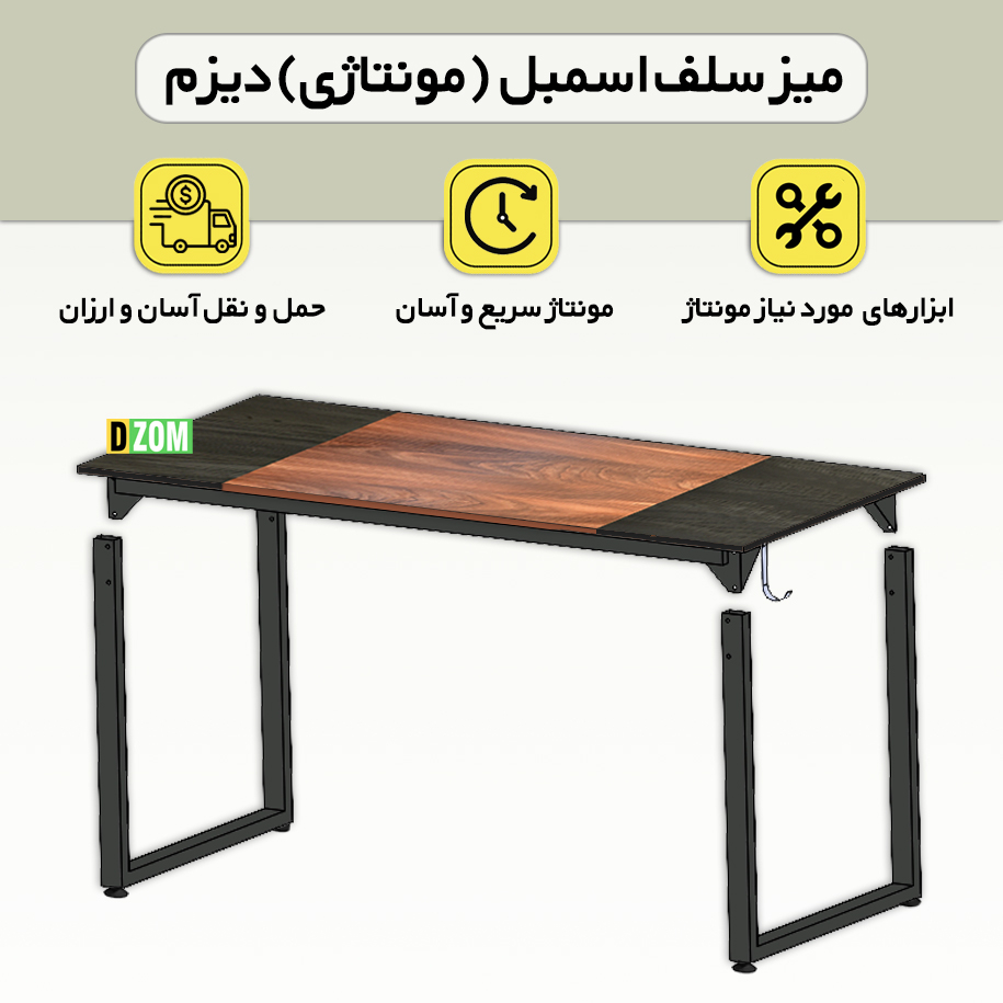 میز تحریر دیزم DZom مدل مونتاژی WD_asm_160×80_Tri_BABRN محصولی مونتاژی، سبک، شیک و در عین حال جذاب و کارآمد از سری تولیدات دیزم میباشد. مشتری گرامی توجه نمایید برند دیزم (شماره ثبت 414013 اداره ثبت علائم تجاری) هیچگونه نمایندگی فروش در بازارهای فیزیکی و آنلاین نداشته و محصولات خود را با کیفیت و بسته بندی اصلی، مستقیما از طریق سایت Dzom.ir یا شبکه های اجتماعی خود به مصرف کننده (End User) عرضه می نماید. لطفا از خرید کالای تقلبی از سایر فروشندگان خودداری فرمایید. این محصول بصورت سلف اسمبل (مونتاژی) تولید شده است. این میز حمل و نقل آسان و هزینه حمل مقرون به صرفه ای دارد. این میز از پایه های فلزی با مقطع 50×30 میلیمتر و رنگ رویه الکترواستاتیک با ماندگاری و دوام بالا ساخته شده است. همچنین پایه های پیچی، قابلیت تنظیم نسبت به سطح زمین را دارد تا بهترین تراز جهت جلوگیری از تکان خوردن را ایجاد نماید. صفحه میز از جنس MDF درجه یک برجسته طرح چوب با ترکیبی از دو رنگ مشکی و قهوه ای می باشد. این محصول با طول 160cm، عرض 80cm و ارتفاع 75cm عرضه می شود. به این نکته توجه شود که تنوع رنگ انتخابی کالا تنها مربوط به رنگ پایه های فلزی میباشد.