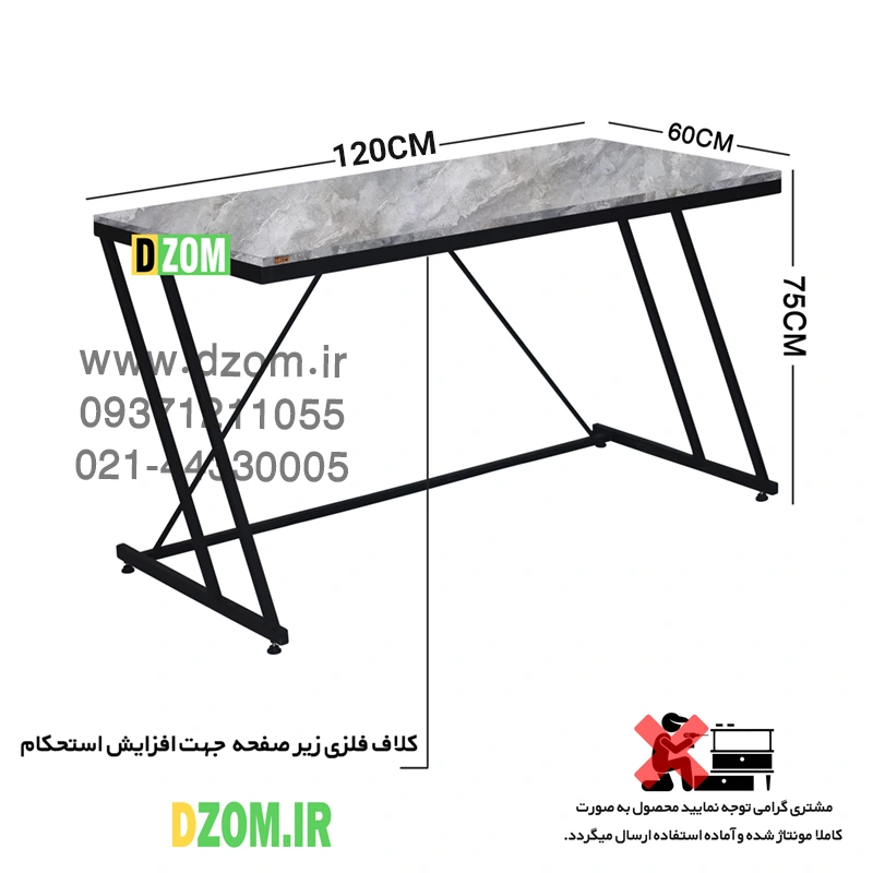 میز دیزم DZom مدل WD-77E25-120GRONE محصولی سبک، شیک و در عین حال جذاب و کارآمد از سری تولیدات دیزم میباشد. مشتری گرامی توجه نمایید برند دیزم (شماره ثبت 414013 اداره ثبت علائم تجاری) هیچگونه نمایندگی فروش در بازارهای فیزیکی و آنلاین نداشته و محصولات خود را با کیفیت و بسته بندی اصلی، مستقیما از طریق سایت Dzom.ir یا شبکه های اجتماعی خود به مصرف کننده (End User) عرضه می نماید. لطفا از خرید کالای تقلبی از سایر فروشندگان خودداری فرمایید. این میز از پایه های فلزی با رنگ رویه الکترواستاتیک با ماندگاری و دوام بالا ساخته شده است. همچنین پایه های پیچی، قابلیت تنظیم نسبت به سطح زمین را دارد تا بهترین تراز جهت جلوگیری از تکان خوردن را ایجاد نماید. صفحه میز از جنس MDF درجه یک برجسته به رنگ طوسی می باشد. این محصول با طول 120cm، عرض 60cm و ارتفاع 75cm عرضه می شود. به این نکته توجه شود که تنوع رنگ انتخابی کالا تنها مربوط به رنگ پایه های فلزی میباشد و محصول به صورت کاملا مونتاژ شده و آماده استفاده برای مشتریان ارسال می گردد.