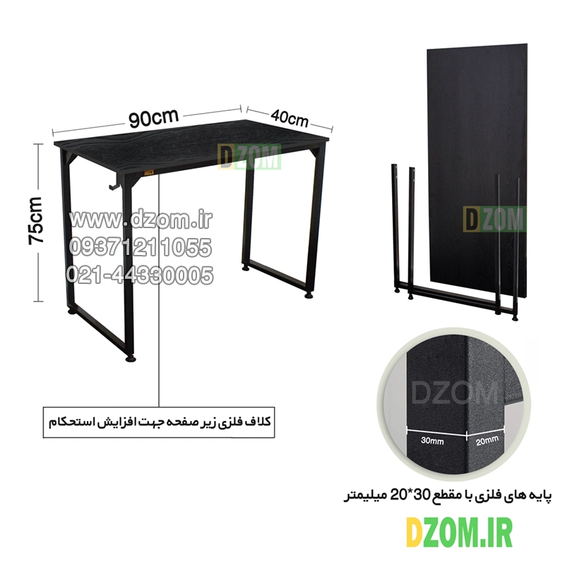 میز تحریر دیزم DZom مدل مونتاژی WD_asm_90×40_B محصولی مونتاژی، سبک، شیک و در عین حال جذاب و کارآمد از سری تولیدات دیزم میباشد. مشتری گرامی توجه نمایید برند دیزم (شماره ثبت 414013 اداره ثبت علائم تجاری) هیچگونه نمایندگی فروش در بازارهای فیزیکی و آنلاین نداشته و محصولات خود را با کیفیت و بسته بندی اصلی، مستقیما از طریق سایت Dzom.ir یا شبکه های اجتماعی خود به مصرف کننده (End User) عرضه می نماید. لطفا از خرید کالای تقلبی از سایر فروشندگان خودداری فرمایید. این محصول بصورت سلف اسمبل (مونتاژی) تولید شده است. این میز حمل و نقل آسان و هزینه حمل مقرون به صرفه ای دارد. این میز از پایه های فلزی با مقطع 30×20 میلیمتر و رنگ رویه الکترواستاتیک با ماندگاری و دوام بالا ساخته شده است. همچنین پایه های پیچی، قابلیت تنظیم نسبت به سطح زمین را دارد تا بهترین تراز جهت جلوگیری از تکان خوردن را ایجاد نماید. صفحه میز از جنس MDF درجه یک برجسته طرح چوب به رنگ مشکی می باشد. این محصول با طول 90cm، عرض 40cm و ارتفاع 75cm عرضه می شود. به این نکته توجه شود که تنوع رنگ انتخابی کالا تنها مربوط به رنگ پایه های فلزی میباشد.