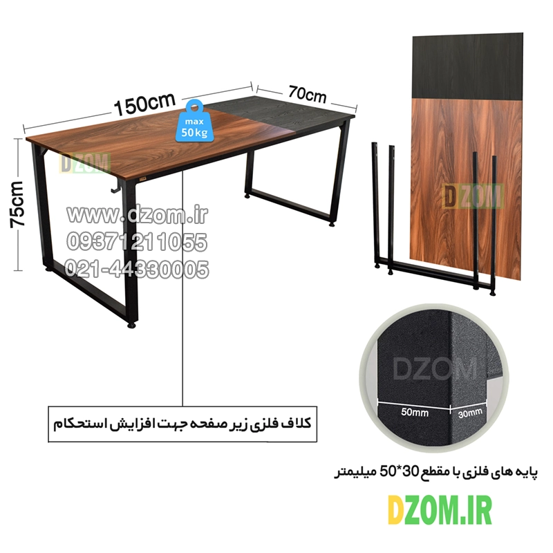 میز مدیریت دیزم DZom مدل مونتاژی TLD_asm_150×70_Di_BABRN محصولی مونتاژی، سبک، شیک و در عین حال جذاب و کارآمد از سری تولیدات دیزم میباشد. این محصول بصورت سلف اسمبل (مونتاژی) تولید شده است. مشتری گرامی توجه نمایید برند دیزم (شماره ثبت 414013 اداره ثبت علائم تجاری) هیچگونه نمایندگی فروش در بازارهای فیزیکی و آنلاین نداشته و محصولات خود را با کیفیت و بسته بندی اصلی، مستقیما از طریق سایت Dzom.ir یا شبکه های اجتماعی خود به مصرف کننده (End User) عرضه می نماید. لطفا از خرید کالای تقلبی از سایر فروشندگان خودداری فرمایید. این میز حمل و نقل آسان و هزینه حمل مقرون به صرفه ای دارد. این میز از پایه های فلزی با مقطع 50×30 میلیمتر و رنگ رویه الکترواستاتیک با ماندگاری و دوام بالا ساخته شده است. همچنین پایه های پیچی، قابلیت تنظیم نسبت به سطح زمین را دارد تا بهترین تراز جهت جلوگیری از تکان خوردن را ایجاد نماید. صفحه میز از جنس MDF درجه یک برجسته طرح چوب و ترکیبی از دو رنگ مشکی و قهوه ای می باشد. این محصول با طول 150cm، عرض 70cm و ارتفاع 75cm عرضه می شود. به این نکته توجه شود که تنوع رنگ انتخابی کالا تنها مربوط به رنگ پایه های فلزی میباشد.