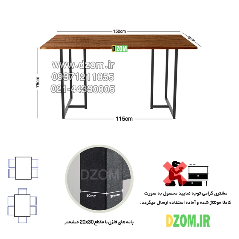 میز ناهارخوری دیزم DZom مدل LNC_750_150_BRN محصولی سبک، شیک و در عین حال جذاب و کارآمد از سری تولیدات دیزم میباشد. مشتری گرامی توجه نمایید برند دیزم(شماره ثبت 414013 اداره ثبت علائم تجاری) هیچگونه نمایندگی فروش در بازارهای فیزیکی و آنلاین نداشته و محصولات خود را با کیفیت و بسته بندی اصلی، مستقیما از طریق سایت Dzom.ir یا شبکه های اجتماعی خود به مصرف کننده (End User) عرضه می نماید. لطفا از خرید کالای تقلبی از سایر فروشندگان خودداری فرمایید. این محصول از پایه های فلزی با مقطع 20×30 میلیمتر و رنگ رویه الکترواستاتیک با ماندگاری و دوام بالا ساخته شده است. همچنین پایه های پیچی، قابلیت تنظیم نسبت به سطح زمین را دارد تا بهترین تراز جهت جلوگیری از تکان خوردن را ایجاد نماید. صفحه محصول از جنس MDF درجه یک برجسته طرح چوب و به رنگ قهوه ای می باشد. این محصول با طول 150cm، عرض 80cm و ارتفاع 75cm عرضه می شود. به این نکته توجه شود که تنوع رنگ انتخابی کالا تنها مربوط به رنگ پایه های فلزی میباشد و محصول به صورت کاملا مونتاژ شده و آماده استفاده برای مشتریان ارسال می گردد.