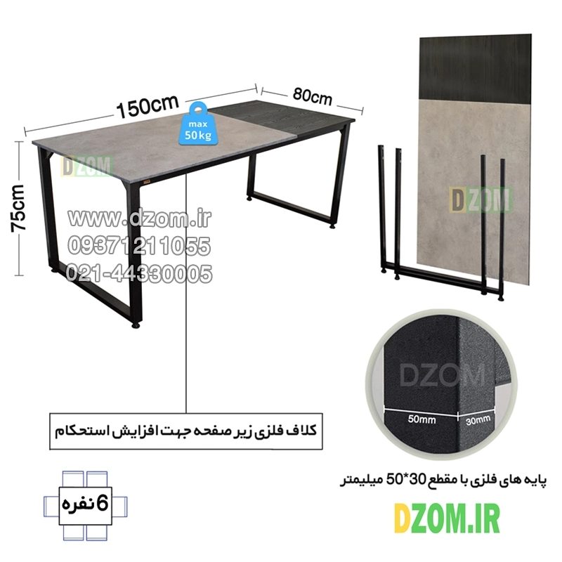 میز ناهارخوری دیزم DZom مدل مونتاژی LNC_asm_150×80_Di_BAGR محصولی مونتاژی، سبک، شیک و در عین حال جذاب و کارآمد از سری تولیدات دیزم میباشد. این محصول بصورت سلف اسمبل (مونتاژی) تولید شده است. مشتری گرامی توجه نمایید برند دیزم (شماره ثبت 414013 اداره ثبت علائم تجاری) هیچگونه نمایندگی فروش در بازارهای فیزیکی و آنلاین نداشته و محصولات خود را با کیفیت و بسته بندی اصلی، مستقیما از طریق سایت Dzom.ir یا شبکه های اجتماعی خود به مصرف کننده (End User) عرضه می نماید. لطفا از خرید کالای تقلبی از سایر فروشندگان خودداری فرمایید. این میز حمل و نقل آسان و هزینه حمل مقرون به صرفه ای دارد. این میز از پایه های فلزی با مقطع 50×30 میلیمتر و رنگ رویه الکترواستاتیک با ماندگاری و دوام بالا ساخته شده است. همچنین پایه های پیچی، قابلیت تنظیم نسبت به سطح زمین را دارد تا بهترین تراز جهت جلوگیری از تکان خوردن را ایجاد نماید. صفحه میز ترکیبی از MDF درجه یک برجسته طرح چوب به رنگ مشکی و MDF درجه یک به رنگ طوسی می باشد. این محصول با طول 150cm، عرض 80cm و ارتفاع 75cm عرضه می شود. به این نکته توجه شود که تنوع رنگ انتخابی کالا تنها مربوط به رنگ پایه های فلزی میباشد.