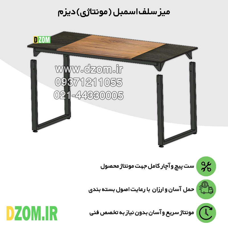 میز ناهارخوری دیزم DZom مدل مونتاژی LNC_asm_150×80_Tri_BALIGHT محصولی مونتاژی، سبک، شیک و در عین حال جذاب و کارآمد از سری تولیدات دیزم میباشد. این محصول بصورت سلف اسمبل (مونتاژی) تولید شده است. مشتری گرامی توجه نمایید برند دیزم (شماره ثبت 414013 اداره ثبت علائم تجاری) هیچگونه نمایندگی فروش در بازارهای فیزیکی و آنلاین نداشته و محصولات خود را با کیفیت و بسته بندی اصلی، مستقیما از طریق سایت Dzom.ir یا شبکه های اجتماعی خود به مصرف کننده (End User) عرضه می نماید. لطفا از خرید کالای تقلبی از سایر فروشندگان خودداری فرمایید. این میز حمل و نقل آسان و هزینه حمل مقرون به صرفه ای دارد. این میز از پایه های فلزی با مقطع 50×30 میلیمتر و رنگ رویه الکترواستاتیک با ماندگاری و دوام بالا ساخته شده است. همچنین پایه های پیچی، قابلیت تنظیم نسبت به سطح زمین را دارد تا بهترین تراز جهت جلوگیری از تکان خوردن را ایجاد نماید. صفحه میز از جنس MDF درجه یک برجسته طرح چوب با ترکیبی از دو رنگ مشکی و قهوه ای روشن می باشد. این محصول با طول 150cm، عرض 80cm و ارتفاع 75cm عرضه می شود. به این نکته توجه شود که تنوع رنگ انتخابی کالا تنها مربوط به رنگ پایه های فلزی میباشد.