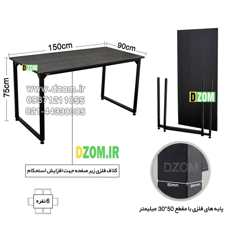 میز ناهارخوری دیزم DZom مدل مونتاژی LNC_asm_150×90_B محصولی مونتاژی، سبک، شیک و در عین حال جذاب و کارآمد از سری تولیدات دیزم میباشد. مشتری گرامی توجه نمایید برند دیزم (شماره ثبت 414013 اداره ثبت علائم تجاری) هیچگونه نمایندگی فروش در بازارهای فیزیکی و آنلاین نداشته و محصولات خود را با کیفیت و بسته بندی اصلی، مستقیما از طریق سایت Dzom.ir یا شبکه های اجتماعی خود به مصرف کننده (End User) عرضه می نماید. لطفا از خرید کالای تقلبی از سایر فروشندگان خودداری فرمایید. این محصول بصورت سلف اسمبل (مونتاژی) تولید شده است. این میز حمل و نقل آسان و هزینه حمل مقرون به صرفه ای دارد. این میز از پایه های فلزی با مقطع 50×30 میلیمتر و رنگ رویه الکترواستاتیک با ماندگاری و دوام بالا ساخته شده است. همچنین پایه های پیچی، قابلیت تنظیم نسبت به سطح زمین را دارد تا بهترین تراز جهت جلوگیری از تکان خوردن را ایجاد نماید. صفحه میز از جنس MDF درجه یک برجسته طرح چوب به رنگ مشکی می باشد. این محصول با طول 150cm، عرض 90cm و ارتفاع 75cm عرضه می شود. به این نکته توجه شود که تنوع رنگ انتخابی کالا تنها مربوط به رنگ پایه های فلزی میباشد.