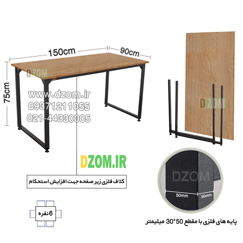 میز ناهارخوری دیزم DZom مدل مونتاژی LNC_asm_150×90_LIGHT محصولی مونتاژی، سبک، شیک و در عین حال جذاب و کارآمد از سری تولیدات دیزم میباشد. مشتری گرامی توجه نمایید برند دیزم (شماره ثبت 414013 اداره ثبت علائم تجاری) هیچگونه نمایندگی فروش در بازارهای فیزیکی و آنلاین نداشته و محصولات خود را با کیفیت و بسته بندی اصلی، مستقیما از طریق سایت Dzom.ir یا شبکه های اجتماعی خود به مصرف کننده (End User) عرضه می نماید. لطفا از خرید کالای تقلبی از سایر فروشندگان خودداری فرمایید. این محصول بصورت سلف اسمبل (مونتاژی) تولید شده است. این میز حمل و نقل آسان و هزینه حمل مقرون به صرفه ای دارد. این میز از پایه های فلزی با مقطع 50×30 میلیمتر و رنگ رویه الکترواستاتیک با ماندگاری و دوام بالا ساخته شده است. همچنین پایه های پیچی، قابلیت تنظیم نسبت به سطح زمین را دارد تا بهترین تراز جهت جلوگیری از تکان خوردن را ایجاد نماید. صفحه میز از جنس MDF درجه یک برجسته طرح چوب به رنگ قهوه ای روشن می باشد. این محصول با طول 150cm، عرض 90cm و ارتفاع 75cm عرضه می شود. به این نکته توجه شود که تنوع رنگ انتخابی کالا تنها مربوط به رنگ پایه های فلزی میباشد.