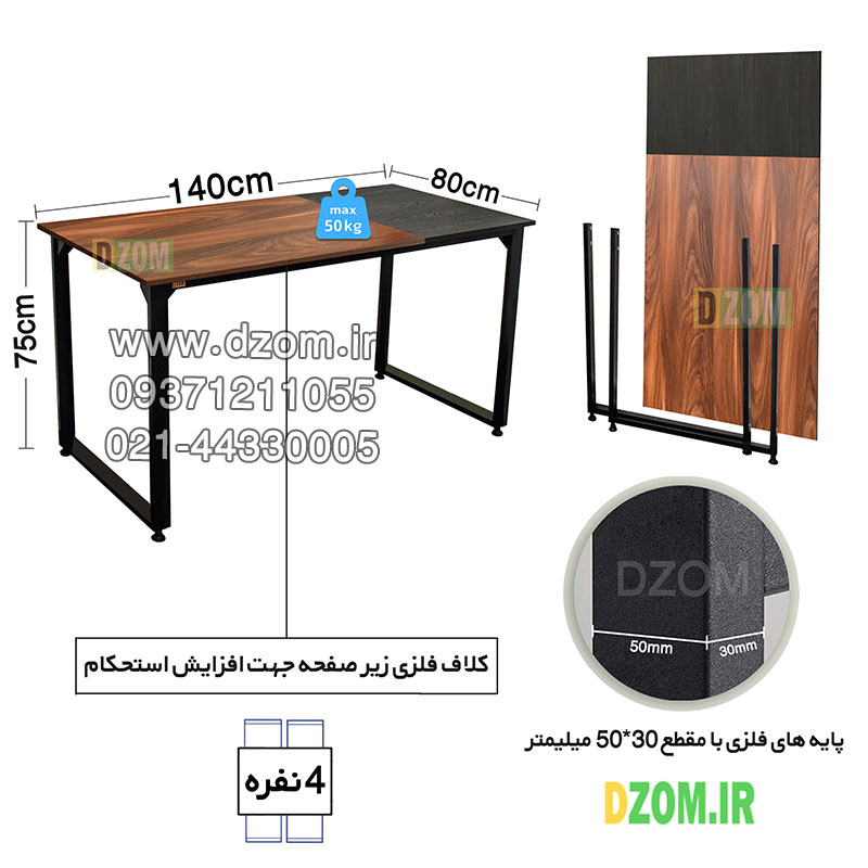 میز ناهارخوری دیزم DZom مدل مونتاژی LNC_asm_140×80_Di_BABRN محصولی مونتاژی، سبک، شیک و در عین حال جذاب و کارآمد از سری تولیدات دیزم میباشد. مشتری گرامی توجه نمایید برند دیزم (شماره ثبت 414013 اداره ثبت علائم تجاری) هیچگونه نمایندگی فروش در بازارهای فیزیکی و آنلاین نداشته و محصولات خود را با کیفیت و بسته بندی اصلی، مستقیما از طریق سایت Dzom.ir یا شبکه های اجتماعی خود به مصرف کننده (End User) عرضه می نماید. لطفا از خرید کالای تقلبی از سایر فروشندگان خودداری فرمایید. این میز حمل و نقل آسان و هزینه حمل مقرون به صرفه ای دارد. این میز از پایه های فلزی با مقطع 50×30 میلیمتر و رنگ رویه الکترواستاتیک با ماندگاری و دوام بالا ساخته شده است. همچنین پایه های پیچی، قابلیت تنظیم نسبت به سطح زمین را دارد تا بهترین تراز جهت جلوگیری از تکان خوردن را ایجاد نماید. صفحه میز از جنس MDF درجه یک برجسته طرح چوب و ترکیبی از دو رنگ مشکی و قهوه ای می باشد. این محصول با طول 140cm، عرض 80cm و ارتفاع 75cm عرضه می شود. به این نکته توجه شود که تنوع رنگ انتخابی کالا تنها مربوط به رنگ پایه های فلزی میباشد.