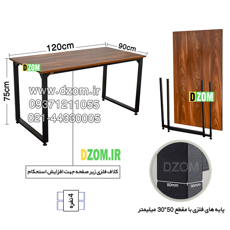 میز ناهارخوری دیزم DZom مدل مونتاژی LNC_asm_120×90_BRN محصولی مونتاژی، سبک، شیک و در عین حال جذاب و کارآمد از سری تولیدات دیزم میباشد. مشتری گرامی توجه نمایید برند دیزم (شماره ثبت 414013 اداره ثبت علائم تجاری) هیچگونه نمایندگی فروش در بازارهای فیزیکی و آنلاین نداشته و محصولات خود را با کیفیت و بسته بندی اصلی، مستقیما از طریق سایت Dzom.ir یا شبکه های اجتماعی خود به مصرف کننده (End User) عرضه می نماید. لطفا از خرید کالای تقلبی از سایر فروشندگان خودداری فرمایید. این محصول بصورت سلف اسمبل (مونتاژی) تولید شده است. این میز حمل و نقل آسان و هزینه حمل مقرون به صرفه ای دارد. این میز از پایه های فلزی با مقطع 50×30 میلیمتر و رنگ رویه الکترواستاتیک با ماندگاری و دوام بالا ساخته شده است. همچنین پایه های پیچی، قابلیت تنظیم نسبت به سطح زمین را دارد تا بهترین تراز جهت جلوگیری از تکان خوردن را ایجاد نماید. صفحه میز از جنس MDF درجه یک برجسته طرح چوب به رنگ قهوه ای می باشد. این محصول با طول 120cm، عرض 90cm و ارتفاع 75cm عرضه می شود. به این نکته توجه شود که تنوع رنگ انتخابی کالا تنها مربوط به رنگ پایه های فلزی میباشد.