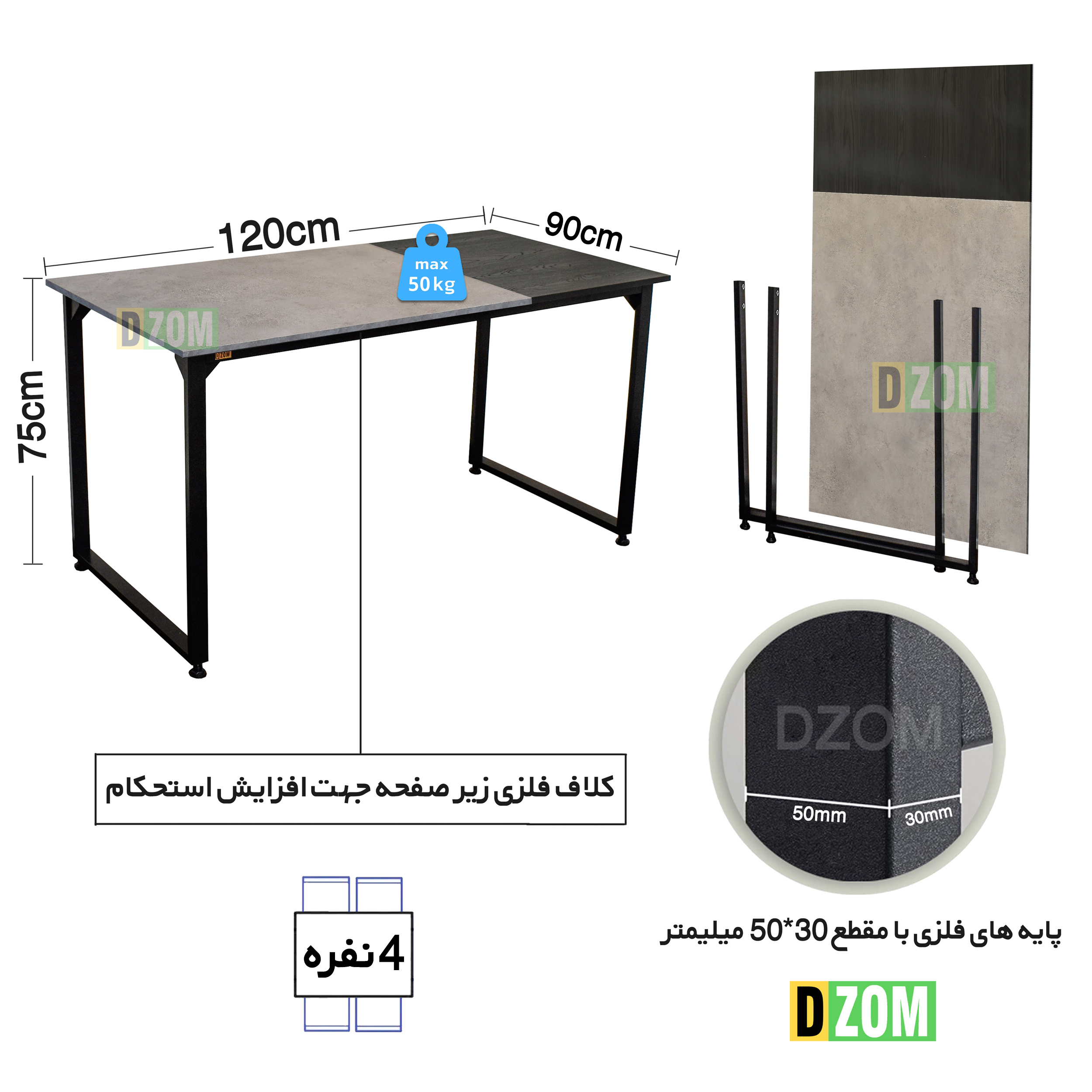 میز ناهارخوری دیزم DZom مدل مونتاژی LNC_asm_120×90_Di_BAGR محصولی مونتاژی، سبک، شیک و در عین حال جذاب و کارآمد از سری تولیدات دیزم میباشد. این محصول بصورت سلف اسمبل (مونتاژی) تولید شده است. مشتری گرامی توجه نمایید برند دیزم (شماره ثبت 414013 اداره ثبت علائم تجاری) هیچگونه نمایندگی فروش در بازارهای فیزیکی و آنلاین نداشته و محصولات خود را با کیفیت و بسته بندی اصلی، مستقیما از طریق سایت Dzom.ir یا شبکه های اجتماعی خود به مصرف کننده (End User) عرضه می نماید. لطفا از خرید کالای تقلبی از سایر فروشندگان خودداری فرمایید. این میز حمل و نقل آسان و هزینه حمل مقرون به صرفه ای دارد. این میز از پایه های فلزی با مقطع 50×30 میلیمتر و رنگ رویه الکترواستاتیک با ماندگاری و دوام بالا ساخته شده است. همچنین پایه های پیچی، قابلیت تنظیم نسبت به سطح زمین را دارد تا بهترین تراز جهت جلوگیری از تکان خوردن را ایجاد نماید. صفحه میز ترکیبی از MDF درجه یک برجسته طرح چوب به رنگ مشکی و MDF درجه یک به رنگ طوسی می باشد. این محصول با طول 120cm، عرض 90cm و ارتفاع 75cm عرضه می شود. به این نکته توجه شود که تنوع رنگ انتخابی کالا تنها مربوط به رنگ پایه های فلزی میباشد.