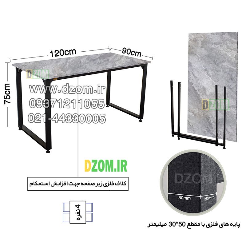 میز ناهارخوری دیزم DZom مدل مونتاژی LNC_asm_120×90_GR محصولی مونتاژی، سبک، شیک و در عین حال جذاب و کارآمد از سری تولیدات دیزم میباشد. مشتری گرامی توجه نمایید برند دیزم (شماره ثبت 414013 اداره ثبت علائم تجاری) هیچگونه نمایندگی فروش در بازارهای فیزیکی و آنلاین نداشته و محصولات خود را با کیفیت و بسته بندی اصلی، مستقیما از طریق سایت Dzom.ir یا شبکه های اجتماعی خود به مصرف کننده (End User) عرضه می نماید. لطفا از خرید کالای تقلبی از سایر فروشندگان خودداری فرمایید. این محصول بصورت سلف اسمبل (مونتاژی) تولید شده است. این میز حمل و نقل آسان و هزینه حمل مقرون به صرفه ای دارد. این میز از پایه های فلزی با مقطع 50×30 میلیمتر و رنگ رویه الکترواستاتیک با ماندگاری و دوام بالا ساخته شده است. همچنین پایه های پیچی، قابلیت تنظیم نسبت به سطح زمین را دارد تا بهترین تراز جهت جلوگیری از تکان خوردن را ایجاد نماید. صفحه میز از جنس MDF درجه یک به رنگ طوسی می باشد. این محصول با طول 120cm، عرض 90cm و ارتفاع 75cm عرضه می شود. به این نکته توجه شود که تنوع رنگ انتخابی کالا تنها مربوط به رنگ پایه های فلزی میباشد.