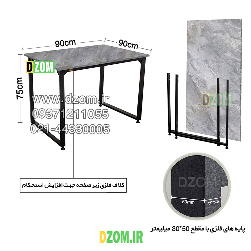 میز ناهارخوری دیزم DZom مدل مونتاژی LNC_asm_90×90_GR محصولی مونتاژی، سبک، شیک و در عین حال جذاب و کارآمد از سری تولیدات دیزم میباشد. مشتری گرامی توجه نمایید برند دیزم (شماره ثبت 414013 اداره ثبت علائم تجاری) هیچگونه نمایندگی فروش در بازارهای فیزیکی و آنلاین نداشته و محصولات خود را با کیفیت و بسته بندی اصلی، مستقیما از طریق سایت Dzom.ir یا شبکه های اجتماعی خود به مصرف کننده (End User) عرضه می نماید. لطفا از خرید کالای تقلبی از سایر فروشندگان خودداری فرمایید. این محصول بصورت سلف اسمبل (مونتاژی) تولید شده است. این میز حمل و نقل آسان و هزینه حمل مقرون به صرفه ای دارد. این میز از پایه های فلزی با مقطع 50×30 میلیمتر و رنگ رویه الکترواستاتیک با ماندگاری و دوام بالا ساخته شده است. همچنین پایه های پیچی، قابلیت تنظیم نسبت به سطح زمین را دارد تا بهترین تراز جهت جلوگیری از تکان خوردن را ایجاد نماید. صفحه میز از جنس MDF درجه یک به رنگ طوسی می باشد. این محصول با طول 90cm، عرض 90cm و ارتفاع 75cm عرضه می شود. به این نکته توجه شود که تنوع رنگ انتخابی کالا تنها مربوط به رنگ پایه های فلزی میباشد.