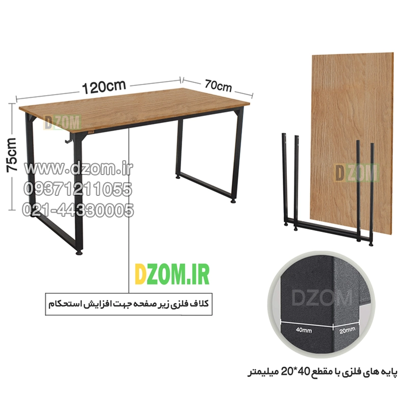 میز کارشناسی دیزم DZom مدل مونتاژی TLD_asm_120×70_LIGHT محصولی مونتاژی، سبک، شیک و در عین حال جذاب و کارآمد از سری تولیدات دیزم میباشد. مشتری گرامی توجه نمایید برند دیزم (شماره ثبت 414013 اداره ثبت علائم تجاری) هیچگونه نمایندگی فروش در بازارهای فیزیکی و آنلاین نداشته و محصولات خود را با کیفیت و بسته بندی اصلی، مستقیما از طریق سایت Dzom.ir یا شبکه های اجتماعی خود به مصرف کننده (End User) عرضه می نماید. لطفا از خرید کالای تقلبی از سایر فروشندگان خودداری فرمایید. این محصول بصورت سلف اسمبل (مونتاژی) تولید شده است. این میز حمل و نقل آسان و هزینه حمل مقرون به صرفه ای دارد. این میز از پایه های فلزی با مقطع 40×20 میلیمتر و رنگ رویه الکترواستاتیک با ماندگاری و دوام بالا ساخته شده است. همچنین پایه های پیچی، قابلیت تنظیم نسبت به سطح زمین را دارد تا بهترین تراز جهت جلوگیری از تکان خوردن را ایجاد نماید. صفحه میز از جنس MDF درجه یک برجسته طرح چوب و به رنگ قهوه ای روشن می باشد. این محصول با طول 120cm، عرض 70cm و ارتفاع 75cm عرضه می شود. به این نکته توجه شود که تنوع رنگ انتخابی کالا تنها مربوط به رنگ پایه های فلزی میباشد.