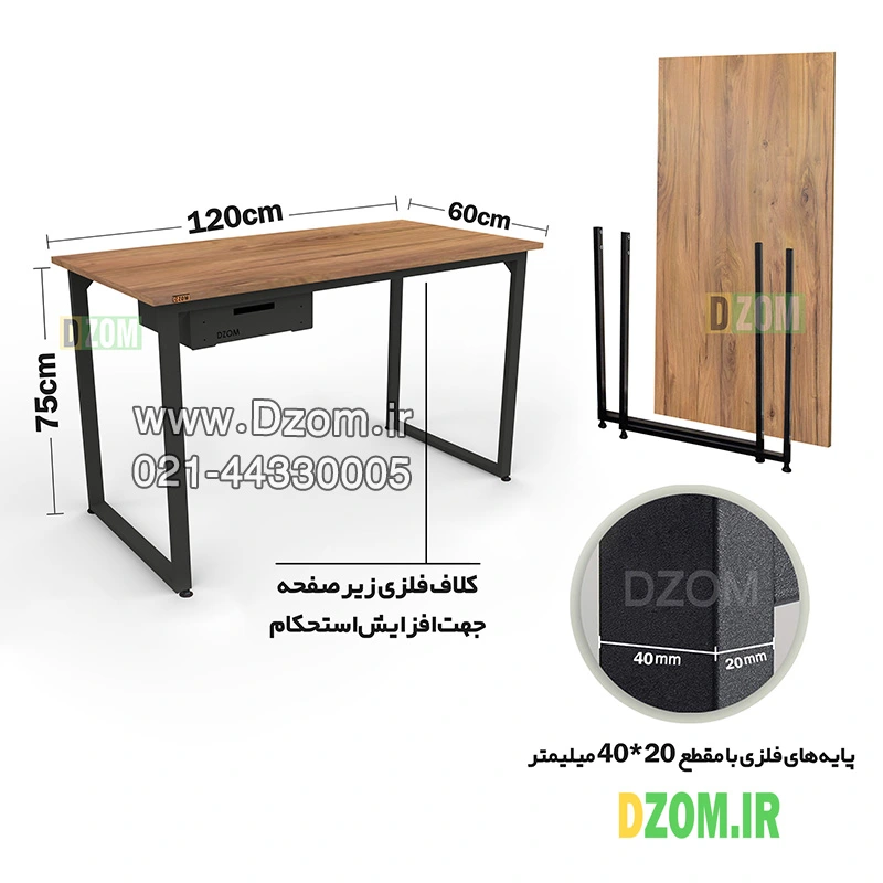 میز کامپیوتر دیزم DZom مدل مونتاژی TLD_dwr_120×60 محصولی مونتاژی، سبک، شیک و در عین حال جذاب و کارآمد از سری تولیدات دیزم می باشد. این محصول به صورت سلفاسمبل (مونتاژی) تولید شده است. مشتری گرامی توجه نمایید برند دیزم (شماره ثبت 414013 اداره ثبت علائم تجاری) هیچگونه نمایندگی فروش در بازارهای فیزیکی و آنلاین نداشته و محصولات خود را با کیفیت و بسته بندی اصلی، مستقیما از طریق سایت Dzom.ir یا شبکه های اجتماعی خود به مصرف کننده (End User) عرضه می نماید. لطفا از خرید کالای تقلبی از سایر فروشندگان خودداری فرمایید. این میز پایه فلزی، مناسب استفاده برای مطالعه، تحریر، امور کارشناسی، اداری، مدیریتی، کار با کامپیوتر و فعالیتهای کارمندی میباشد. حمل و نقل این محصول آسان بوده و هزینه حمل آن مقرون به صرفه است. همچنین پایه های فلزی با مقطع 40×20 میلی متر و رنگ رویه کورهای الکترواستاتیک با ماندگاری و دوام بالا برای این محصول به کار رفته است. پایه های پیچی نیز قابلیت تنظیم نسبت به سطح زمین را دارند تا بهترین تراز را جهت جلوگیری از تکان خوردن ایجاد نمایند. صفحه میز از جنس MDF درجه یک می باشد. یک عدد کشوی تمام فلزی با ریل ساچمه ای سه مرحله ای، قابل نصب در هر دو سمت میز، برای این محصول در نظر گرفته شده است. این محصول با طول 120cm، عرض 60cm و ارتفاع 75cm عرضه میشود. به این نکته توجه شود که تنوع رنگ انتخابی کالا تنها مربوط به رنگ MDF می باشد