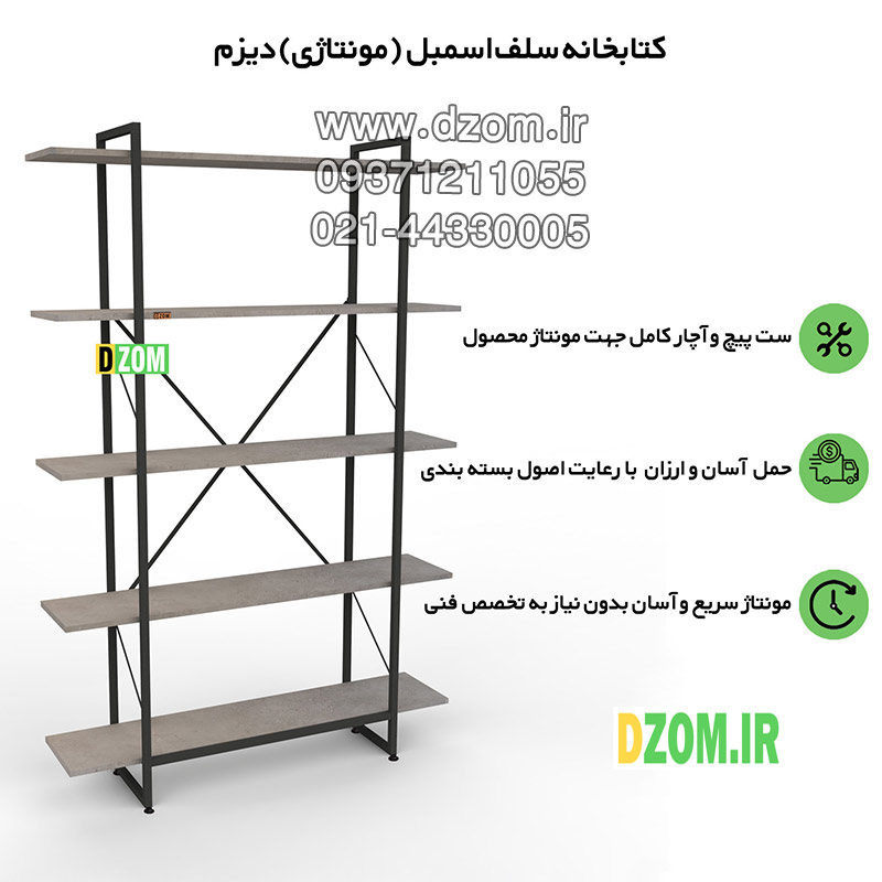 کتابخانه پنج طبقه دیزم DZom مدل مونتاژی LIB_100×180_GR محصولی مونتاژی، سبک، شیک و در عین حال جذاب و کارآمد از سری تولیدات دیزم میباشد. مشتری گرامی توجه نمایید برند دیزم (شماره ثبت 414013 اداره ثبت علائم تجاری) هیچگونه نمایندگی فروش در بازارهای فیزیکی و آنلاین نداشته و محصولات خود را با کیفیت و بسته بندی اصلی، مستقیما از طریق سایت Dzom.ir یا شبکه های اجتماعی خود به مصرف کننده (End User) عرضه می نماید. لطفا از خرید کالای تقلبی از سایر فروشندگان خودداری فرمایید. این محصول بصورت سلف اسمبل (مونتاژی) تولید شده است. این کتابخانه حمل و نقل آسان و هزینه حمل مقرون به صرفه ای دارد. از پایه های فلزی با مقطع 20×20 میلیمتر و رنگ رویه الکترواستاتیک با ماندگاری و دوام بالا ساخته شده است. همچنین پایه های پیچی، قابلیت تنظیم نسبت به سطح زمین را دارد تا بهترین تراز جهت جلوگیری از تکان خوردن را ایجاد نماید. صفحات کتابخانه از جنس MDF درجه یک به رنگ طوسی می باشد. این محصول با طول 100cm، عرض 30cm و ارتفاع 180cm عرضه می شود. به این نکته توجه شود که تنوع رنگ انتخابی کالا تنها مربوط به رنگ پایه های فلزی میباشد. توصیه میشود جهت حفظ ایمنی و ثبات بیشتر، محصول در یک یا دو نقطه به دیوار پیچ گردد.(یراق اتصال داخل بسته بندی موجود است).