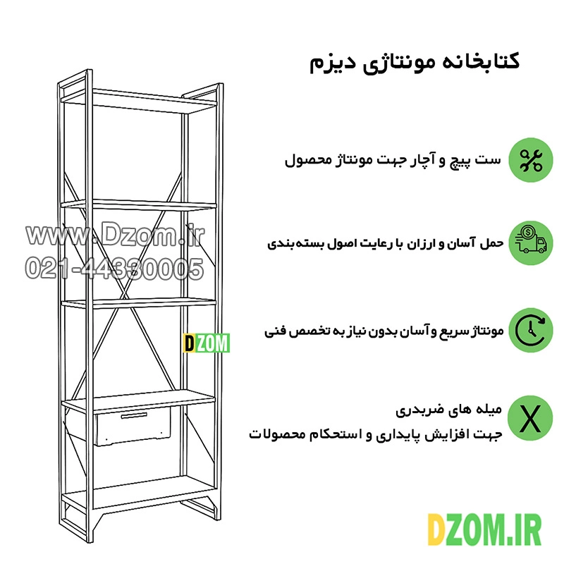 کتابخانه دیزم DZom مدل مونتاژی LIB_dwr_60×180 محصولی مونتاژی، سبک، شیک و در عین حال جذاب و کارآمد از سری تولیدات دیزم می باشد. مشتری گرامی توجه نمایید برند دیزم (شماره ثبت 414013 اداره ثبت علائم تجاری) هیچگونه نمایندگی فروش در بازارهای فیزیکی و آنلاین نداشته و محصولات خود را با کیفیت و بسته بندی اصلی، مستقیما از طریق سایت Dzom.ir یا شبکه های اجتماعی خود به مصرف کننده (End User) عرضه می نماید. لطفا از خرید کالای تقلبی از سایر فروشندگان خودداری فرمایید. این محصول بصورت سلف اسمبل (مونتاژی) تولید شده است. حمل و نقل این محصول آسان بوده و هزینه حمل آن مقرون به صرفه است. همچنین پایه های فلزی با مقطع 20×20 میلی متر و رنگ رویه کورهای الکترواستاتیک با ماندگاری و دوام بالا برای این محصول به کار رفته است. پایه های پیچی نیز قابلیت تنظیم نسبت به سطح زمین را دارند تا بهترین تراز را جهت جلوگیری از تکان خوردن ایجاد نمایند. صفحات کتابخانه از جنس MDF درجه یک می باشد. یک عدد کشوی تمام فلزی با ریل ساچمه ای سه مرحلهای، قابل نصب در هر طبقه ، برای این محصول در نظر گرفته شده است. این محصول با طول 60cm، عرض 30cm و ارتفاع 180cm عرضه می شود. به این نکته توجه شود که تنوع رنگ انتخابی کالا تنها مربوط به رنگ MDF می باشد. توصیه می شود جهت حفظ ایمنی و ثبات بیشتر، محصول در یک یا دو نقطه به دیوار پیچ گردد.(یراق اتصال داخل بسته بندی موجود است).