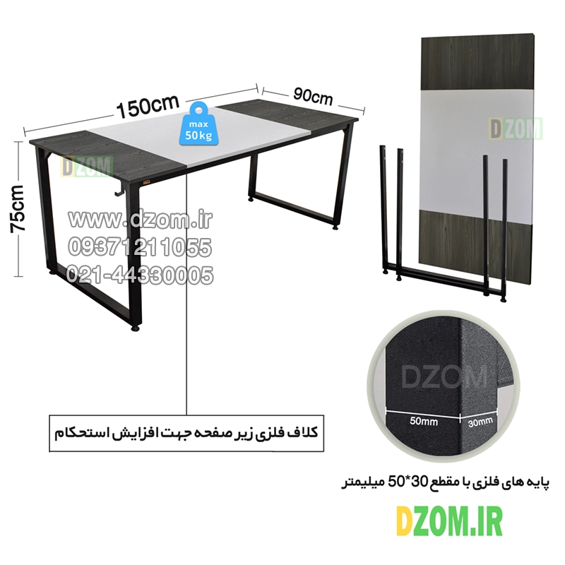میز تحریر دیزم DZom مدل مونتاژی WD_asm_150×90_Tri_BAW محصولی مونتاژی، سبک، شیک و در عین حال جذاب و کارآمد از سری تولیدات دیزم میباشد. این محصول بصورت سلف اسمبل (مونتاژی) تولید شده است. مشتری گرامی توجه نمایید برند دیزم (شماره ثبت 414013 اداره ثبت علائم تجاری) هیچگونه نمایندگی فروش در بازارهای فیزیکی و آنلاین نداشته و محصولات خود را با کیفیت و بسته بندی اصلی، مستقیما از طریق سایت Dzom.ir یا شبکه های اجتماعی خود به مصرف کننده (End User) عرضه می نماید. لطفا از خرید کالای تقلبی از سایر فروشندگان خودداری فرمایید. این میز حمل و نقل آسان و هزینه حمل مقرون به صرفه ای دارد. این میز از پایه های فلزی با مقطع 50×30 میلیمتر و رنگ رویه الکترواستاتیک با ماندگاری و دوام بالا ساخته شده است. همچنین پایه های پیچی، قابلیت تنظیم نسبت به سطح زمین را دارد تا بهترین تراز جهت جلوگیری از تکان خوردن را ایجاد نماید. صفحه میز از جنس MDF درجه یک برجسته طرح چوب با ترکیبی از دو رنگ مشکی و سفید می باشد. این محصول با طول 150cm، عرض 90cm و ارتفاع 75cm عرضه می شود. به این نکته توجه شود که تنوع رنگ انتخابی کالا تنها مربوط به رنگ پایه های فلزی میباشد.