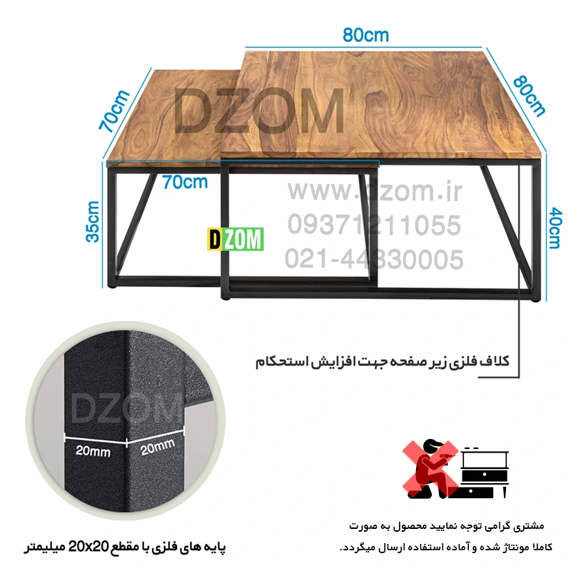 مجموعه دو عددی میز جلو مبلی دیزم DZOM مدل CO_H100_80_BRN محصولی سبک، شیک و در عین حال جذاب و کارآمد از سری تولیدات دیزم است که مناسب دکوراسیون خانه و محل کار شما می باشد. مشتری گرامی توجه نمایید برند دیزم (شماره ثبت 414013 اداره ثبت علائم تجاری) هیچگونه نمایندگی فروش در بازارهای فیزیکی و آنلاین نداشته و محصولات خود را با کیفیت و بسته بندی اصلی، مستقیما از طریق سایت Dzom.ir یا شبکه های اجتماعی خود به مصرف کننده (End User) عرضه می نماید. لطفا از خرید کالای تقلبی از سایر فروشندگان خودداری فرمایید. این میز از پایه های فلزی با مقطع 20×20 میلیمتر و رنگ رویه الکترواستاتیک با ماندگاری و دوام بالا ساخته شده است و دارای پایه های لاستیکی می باشد. صفحه میز از جنس MDF درجه یک برجسته طرح چوب و به رنگ قهوه ای می باشد. این محصول شامل یک میز بزرگ با طول 80cm، عرض 80cm و ارتفاع 40cm و یک میز کوچک با طول 70cm، عرض 70cm و ارتفاع 35cm می باشد. به این نکته توجه شود که تنوع رنگ انتخابی کالا تنها مربوط به رنگ پایه های فلزی میباشد و محصول به صورت کاملا مونتاژ شده و آماده استفاده برای مشتریان ارسال می گردد.