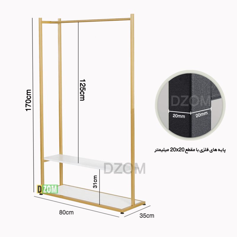 آویز لباس دیزم DZOM مدل RGL_G100_80_W محصولی سبک، شیک و در عین حال جذاب و کارآمد از سری تولیدات دیزم است که مناسب دکوراسیون فروشگاه،محل کار و خانه شما می باشد. مشتری گرامی توجه نمایید محصولات برند دیزم (شماره ثبت 414013 اداره ثبت علائم تجاری) با کیفیت و بسته بندی اصلی تنها توسط فروشنده رسمی دیزم در دیجی کالا عرضه می گردد، لطفا از خرید کالای تقلبی از سایر فروشندگان خودداری فرمایید. برند دیزم هیچگونه نمایندگی فروش در بازارهای فیزیکی و آنلاین نداشته و محصولات خود را مستقیما از طریق سایت Dzom.ir یا شبکه های اجتماعی خود به مصرف کننده (End User) عرضه می نماید. توجه نمایید  این محصول از پایه های فلزی با مقطع 20×20 میلیمتر و رنگ رویه الکترواستاتیک با ماندگاری و دوام بالا ساخته شده است. همچنین پایه ها، قابلیت تنظیم نسبت به سطح زمین را دارد تا بهترین تراز جهت جلوگیری از تکان خوردن رگال را ایجاد نماید. صفحه این محصول از جنس ام دی اف درجه یک برجسته طرح چوب به رنگ سفید می باشد. تنوع رنگ انتخابی مربوط به فریم فلزی می باشد و رنگ صفحه برای این محصول ثابت است. این محصول با طول 80cm، عرض 35cm و ارتفاع 170cm عرضه میشود. لطفا جهت سفارش همین آویز لباس با رنگ صفحه متفاوت به محصولات دیگر فروشنده دیزم رجوع نمایید. توجه نمایید محصولات دیزم به صورت کاملا مونتاژ شده و آماده استفاده برای مشتریان ارسال می گردد.