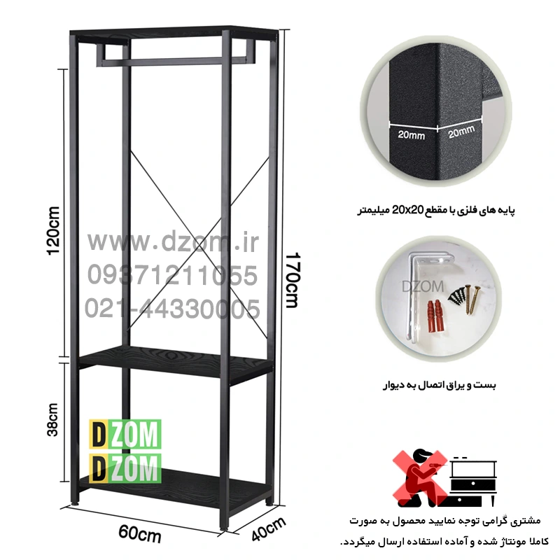 رگال لباس دیزم DZom مدل RGL_69J741_60_B محصولی سبک، شیک و در عین حال جذاب و کارآمد از سری تولیدات دیزم میباشد. مشتری گرامی توجه نمایید برند دیزم (شماره ثبت 414013 اداره ثبت علائم تجاری) هیچگونه نمایندگی فروش در بازارهای فیزیکی و آنلاین نداشته و محصولات خود را با کیفیت و بسته بندی اصلی، مستقیما از طریق سایت Dzom.ir یا شبکه های اجتماعی خود به مصرف کننده (End User) عرضه می نماید. لطفا از خرید کالای تقلبی از سایر فروشندگان خودداری فرمایید. این محصول از پایه های فلزی با مقطع 20×20 میلیمتر و رنگ رویه الکترواستاتیک با ماندگاری و دوام بالا ساخته شده است. همچنین پایه های پیچی، قابلیت تنظیم نسبت به سطح زمین را دارد تا بهترین تراز جهت جلوگیری از تکان خوردن را ایجاد نماید. صفحه محصول از جنس MDF درجه یک برجسته طرح چوب و به رنگ مشکی می باشد. این محصول با طول 60cm، عرض 40cm و ارتفاع 170cm عرضه می شود. به این نکته توجه شود که تنوع رنگ انتخابی کالا تنها مربوط به رنگ پایه های فلزی میباشد و محصول به صورت کاملا مونتاژ شده و آماده استفاده برای مشتریان ارسال می گردد. توصیه میشود جهت حفظ ایمنی و ثبات بیشتر، محصول در یک یا دو نقطه به دیوار پیچ گرد.(یراق اتصال داخل بسته بندی موجود است).