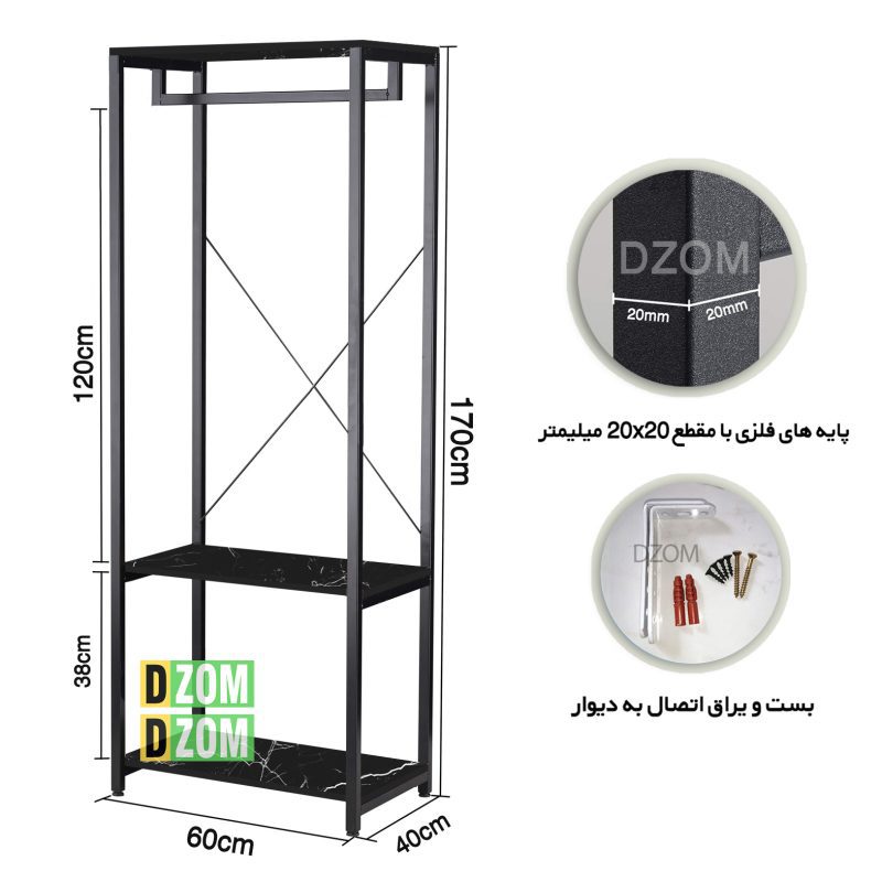 آویز لباس دیزم DZOM مدل RGL_69J741_60_SB محصولی سبک، شیک و در عین حال جذاب و کارآمد از سری تولیدات دیزم است که مناسب دکوراسیون فروشگاه،محل کار و خانه شما می باشد. مشتری گرامی توجه نمایید محصولات برند دیزم (شماره ثبت 414013 اداره ثبت علائم تجاری) با کیفیت و بسته بندی اصلی تنها توسط فروشنده رسمی دیزم در دیجی کالا عرضه می گردد، لطفا از خرید کالای تقلبی از سایر فروشندگان خودداری فرمایید. برند دیزم هیچگونه نمایندگی فروش در بازارهای فیزیکی و آنلاین نداشته و محصولات خود را مستقیما از طریق سایت Dzom.ir یا شبکه های اجتماعی خود به مصرف کننده (End User) عرضه می نماید. این محصول از پایه های فلزی با مقطع 20×20 میلیمتر و رنگ رویه الکترواستاتیک با ماندگاری و دوام بالا ساخته شده است. همچنین پایه های پیچی، قابلیت تنظیم نسبت به سطح زمین را دارد تا بهترین تراز جهت جلوگیری از تکان خوردن را ایجاد نماید. صفحه محصول از جنس MDF درجه یک طرح سنگ و به رنگ مشکی می باشد. این محصول با طول 60cm، عرض 40cm و ارتفاع 170cm عرضه می شود. به این نکته توجه شود که تنوع رنگ انتخابی کالا تنها مربوط به رنگ پایه های فلزی میباشد و محصول به صورت کاملا مونتاژ شده و آماده استفاده برای مشتریان ارسال می گردد. توصیه میشود جهت حفظ ایمنی و ثبات بیشتر، محصول در یک یا دو نقطه به دیوار پیچ گرد.(یراق اتصال داخل بسته بندی موجود است).