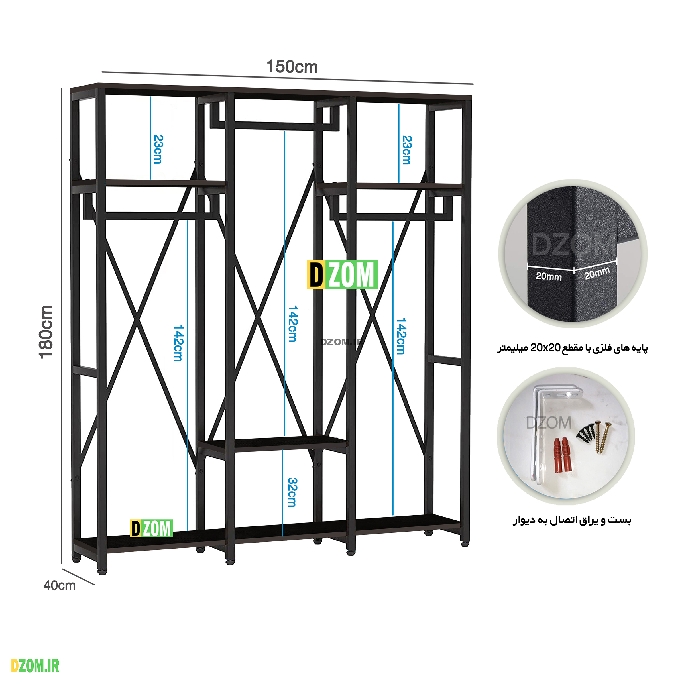 آویز لباس دیزم DZom مدل RGL_C100_150_B محصولی سبک، شیک و در عین حال جذاب و کارآمد از سری تولیدات دیزم میباشد. مشتری گرامی توجه نمایید محصولات برند دیزم (شماره ثبت 414013 اداره ثبت علائم تجاری) با کیفیت و بسته بندی اصلی تنها توسط فروشنده رسمی دیزم در دیجی کالا عرضه می گردد، لطفا از خرید کالای تقلبی از سایر فروشندگان خودداری فرمایید. برند دیزم هیچگونه نمایندگی فروش در بازارهای فیزیکی و آنلاین نداشته و محصولات خود را مستقیما از طریق سایت Dzom.ir یا شبکه های اجتماعی خود به مصرف کننده (End User) عرضه می نماید. این محصول از پایه های فلزی با مقطع 20×20 میلیمتر و رنگ رویه الکترواستاتیک با ماندگاری و دوام بالا ساخته شده است. همچنین پایه های پیچی، قابلیت تنظیم نسبت به سطح زمین را دارد تا بهترین تراز جهت جلوگیری از تکان خوردن را ایجاد نماید. صفحه میز از جنس MDF درجه یک برجسته طرح چوب به رنگ مشکی می باشد. این محصول با طول 150cm، عرض 40cm و ارتفاع 180cmعرضه می شود. به این نکته توجه شود که تنوع رنگ انتخابی کالا تنها مربوط به رنگ پایه های فلزی میباشد و محصول به صورت کاملا مونتاژ شده و آماده استفاده برای مشتریان ارسال می گردد. توصیه میشود جهت حفظ ایمنی و ثبات بیشتر، محصول در یک یا دو نقطه به دیوار پیچ گرد.(یراق اتصال داخل بسته بندی موجود است).
