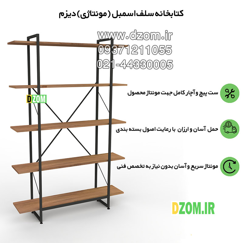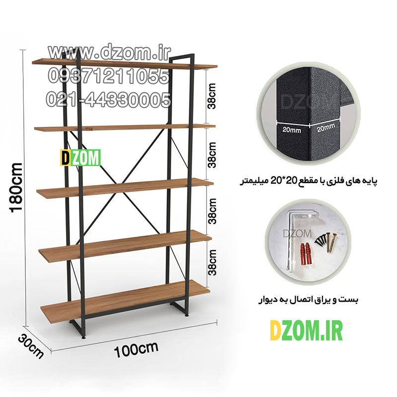 شلف پنج طبقه دیزم DZom مدل مونتاژی SLF_100×180_LIGHT محصولی مونتاژی، سبک، شیک و در عین حال جذاب و کارآمد از سری تولیدات دیزم میباشد. مشتری گرامی توجه نمایید برند دیزم (شماره ثبت 414013 اداره ثبت علائم تجاری) هیچگونه نمایندگی فروش در بازارهای فیزیکی و آنلاین نداشته و محصولات خود را با کیفیت و بسته بندی اصلی، مستقیما از طریق سایت Dzom.ir یا شبکه های اجتماعی خود به مصرف کننده (End User) عرضه می نماید. لطفا از خرید کالای تقلبی از سایر فروشندگان خودداری فرمایید. این محصول بصورت سلف اسمبل (مونتاژی) تولید شده است. این شلف حمل و نقل آسان و هزینه حمل مقرون به صرفه ای دارد. از پایه های فلزی با مقطع 20×20 میلیمتر و رنگ رویه الکترواستاتیک با ماندگاری و دوام بالا ساخته شده است. همچنین پایه های پیچی، قابلیت تنظیم نسبت به سطح زمین را دارد تا بهترین تراز جهت جلوگیری از تکان خوردن را ایجاد نماید. صفحات شلف از جنس MDF درجه یک برجسته طرح چوب به رنگ قهوه ای روشن می باشد. این محصول با طول 100cm، عرض 30cm و ارتفاع 180cm عرضه می شود. به این نکته توجه شود که تنوع رنگ انتخابی کالا تنها مربوط به رنگ پایه های فلزی میباشد. توصیه میشود جهت حفظ ایمنی و ثبات بیشتر، محصول در یک یا دو نقطه به دیوار پیچ گردد.(یراق اتصال داخل بسته بندی موجود است).