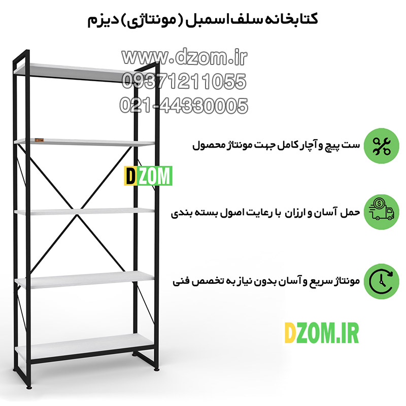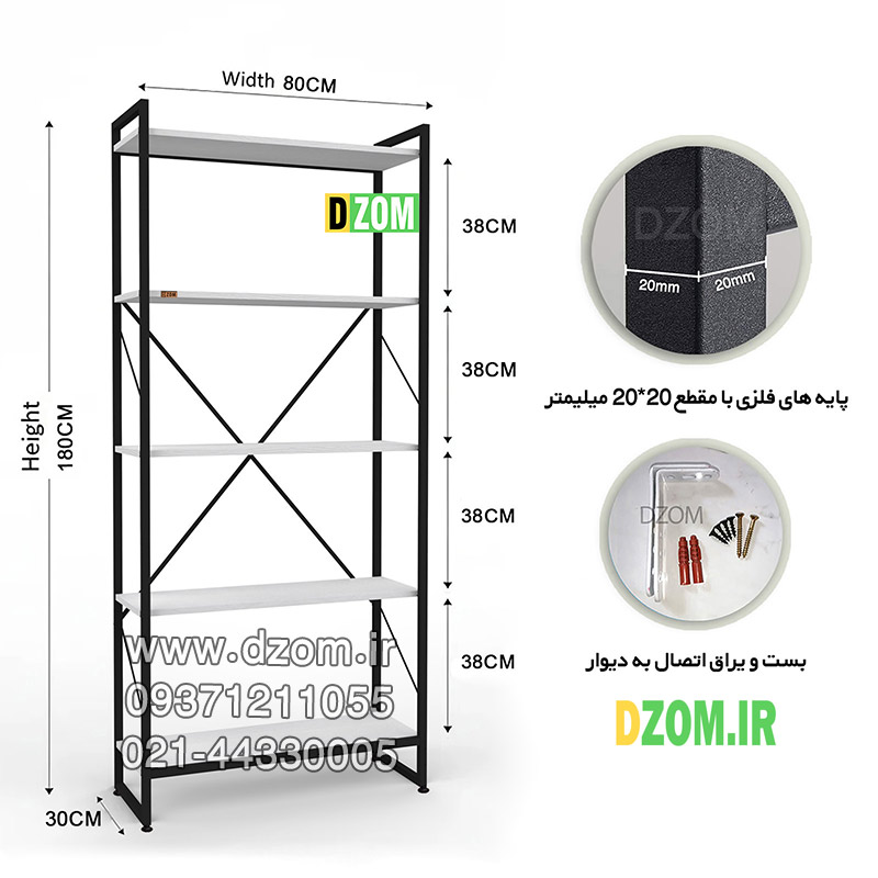 شلف ایستاده دیزم DZom مدل مونتاژی SLF_80×180_W محصولی مونتاژی، سبک، شیک و در عین حال جذاب و کارآمد از سری تولیدات دیزم میباشد. مشتری گرامی توجه نمایید برند دیزم (شماره ثبت 414013 اداره ثبت علائم تجاری) هیچگونه نمایندگی فروش در بازارهای فیزیکی و آنلاین نداشته و محصولات خود را با کیفیت و بسته بندی اصلی، مستقیما از طریق سایت Dzom.ir یا شبکه های اجتماعی خود به مصرف کننده (End User) عرضه می نماید. لطفا از خرید کالای تقلبی از سایر فروشندگان خودداری فرمایید. این محصول بصورت سلف اسمبل (مونتاژی) تولید شده است. این شلف حمل و نقل آسان و هزینه حمل مقرون به صرفه ای دارد. از پایه های فلزی با مقطع 20×20 میلیمتر و رنگ رویه الکترواستاتیک با ماندگاری و دوام بالا ساخته شده است. همچنین پایه های پیچی، قابلیت تنظیم نسبت به سطح زمین را دارد تا بهترین تراز جهت جلوگیری از تکان خوردن را ایجاد نماید. صفحات شلف از جنس MDF درجه یک برجسته طرح چوب به رنگ سفید می باشد. این محصول با طول 80cm، عرض 30cm و ارتفاع 180cm عرضه می شود. به این نکته توجه شود که تنوع رنگ انتخابی کالا تنها مربوط به رنگ پایه های فلزی میباشد. توصیه میشود جهت حفظ ایمنی و ثبات بیشتر، محصول در یک یا دو نقطه به دیوار پیچ گردد.(یراق اتصال داخل بسته بندی موجود است).