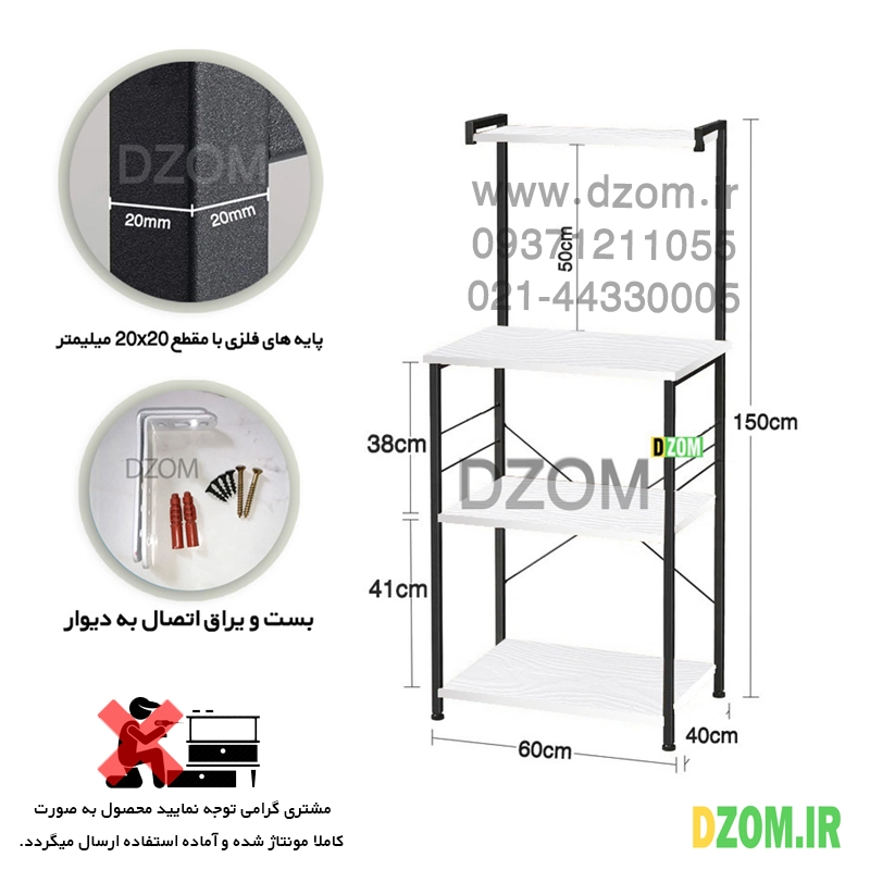 کافی بار دیزم DZom مدل SLF_F100_60_BRN محصولی سبک، شیک و در عین حال جذاب و کارآمد از سری تولیدات دیزم میباشد. مشتری گرامی توجه نمایید برند دیزم (شماره ثبت 414013 اداره ثبت علائم تجاری) هیچگونه نمایندگی فروش در بازارهای فیزیکی و آنلاین نداشته و محصولات خود را با کیفیت و بسته بندی اصلی، مستقیما از طریق سایت Dzom.ir یا شبکه های اجتماعی خود به مصرف کننده (End User) عرضه می نماید. لطفا از خرید کالای تقلبی از سایر فروشندگان خودداری فرمایید. این محصول از پایه های فلزی با مقطع 20×20 میلیمتر و رنگ رویه الکترواستاتیک با ماندگاری و دوام بالا ساخته شده است. همچنین پایه های پیچی، قابلیت تنظیم نسبت به سطح زمین را دارد تا بهترین تراز جهت جلوگیری از تکان خوردن را ایجاد نماید. صفحه میز از جنس MDF درجه یک برجسته طرح چوب به رنگ سفید می باشد. این محصول با طول 60cm، عرض 40cm و ارتفاع 150cm عرضه می شود. به این نکته توجه شود که تنوع رنگ انتخابی کالا تنها مربوط به رنگ پایه های فلزی میباشد و محصول به صورت کاملا مونتاژ شده و آماده استفاده برای مشتریان ارسال می گردد. توصیه میشود جهت حفظ ایمنی و ثبات بیشتر، محصول در یک یا دو نقطه به دیوار پیچ گرد.(یراق اتصال داخل بسته بندی موجود است).