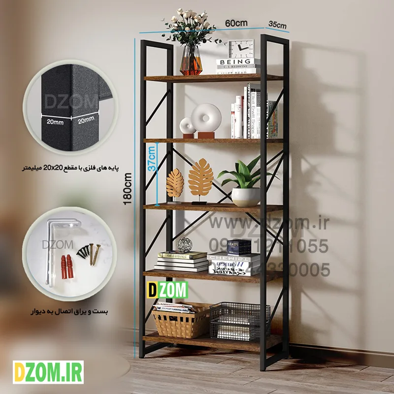 شلف دیزم DZom مدل SLF-16G19-60BRN محصولی سبک، شیک و در عین حال جذاب و کارآمد از سری تولیدات دیزم میباشد. مشتری گرامی توجه نمایید برند دیزم (شماره ثبت 414013 اداره ثبت علائم تجاری) هیچگونه نمایندگی فروش در بازارهای فیزیکی و آنلاین نداشته و محصولات خود را با کیفیت و بسته بندی اصلی، مستقیما از طریق سایت Dzom.ir یا شبکه های اجتماعی خود به مصرف کننده (End User) عرضه می نماید. لطفا از خرید کالای تقلبی از سایر فروشندگان خودداری فرمایید. این محصول از پایه های فلزی با مقطع 20×20 میلیمتر و رنگ رویه الکترواستاتیک با ماندگاری و دوام بالا ساخته شده است. همچنین پایه های پیچی، قابلیت تنظیم نسبت به سطح زمین را دارد تا بهترین تراز جهت جلوگیری از تکان خوردن را ایجاد نماید. صفحه محصول از جنس MDF درجه یک برجسته طرح چوب به رنگ قهوه ای می باشد. این محصول با طول 60cm، عرض 35cm و ارتفاع 180cmعرضه می شود. به این نکته توجه شود که تنوع رنگ انتخابی کالا تنها مربوط به رنگ پایه های فلزی میباشد و محصول به صورت کاملا مونتاژ شده و آماده استفاده برای مشتریان ارسال می گردد. توصیه میشود جهت حفظ ایمنی و ثبات بیشتر، محصول در یک یا دو نقطه به دیوار پیچ گردد.(یراق اتصال داخل بسته بندی موجود است).
