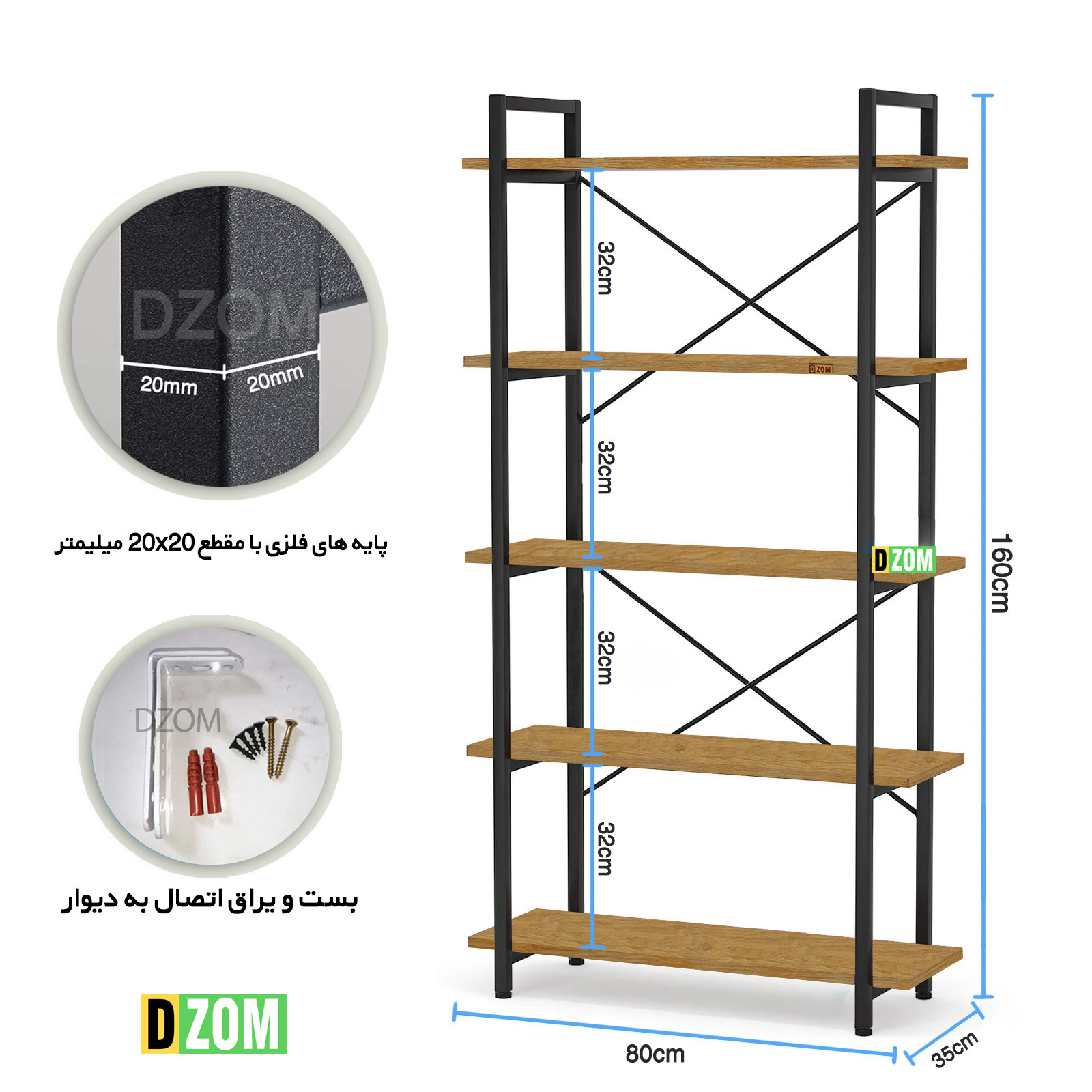 شلف دیواری دیزم DZom مدل SLF-53D43-80LIGHT محصولی سبک، شیک و در عین حال جذاب و کارآمد از سری تولیدات دیزم میباشد. مشتری گرامی توجه نمایید محصولات برند دیزم (شماره ثبت 414013 اداره ثبت علائم تجاری) با کیفیت و بسته بندی اصلی تنها توسط فروشنده رسمی دیزم در دیجی کالا عرضه می گردد، لطفا از خرید کالای تقلبی از سایر فروشندگان خودداری فرمایید. برند دیزم هیچگونه نمایندگی فروش در بازارهای فیزیکی و آنلاین نداشته و محصولات خود را مستقیما از طریق سایت Dzom.ir یا شبکه های اجتماعی خود به مصرف کننده (End user) عرضه می نماید. این محصول از پایه های فلزی با مقطع 20×20 میلیمتر و رنگ رویه الکترواستاتیک با ماندگاری و دوام بالا ساخته شده است. همچنین پایه های پیچی، قابلیت تنظیم نسبت به سطح زمین را دارد تا بهترین تراز جهت جلوگیری از تکان خوردن را ایجاد نماید. صفحه میز از جنس MDF درجه یک برجسته طرح چوب به رنگ قهوه ای روشن می باشد. این محصول با طول 80cm، عرض 35cm و ارتفاع 160cm عرضه می شود. به این نکته توجه شود که تنوع رنگ انتخابی کالا تنها مربوط به رنگ پایه های فلزی میباشد و محصول به صورت کاملا مونتاژ شده و آماده استفاده برای مشتریان ارسال می گردد. توصیه میشود جهت حفظ ایمنی و ثبات بیشتر، محصول در یک یا دو نقطه به دیوار پیچ گردد.(یراق اتصال داخل بسته بندی موجود است).