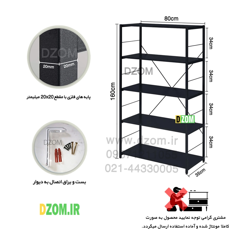 شلف دیزم DZom مدل SLF-88H63-80B محصولی سبک، شیک و در عین حال جذاب و کارآمد از سری تولیدات دیزم میباشد. مشتری گرامی توجه نمایید برند دیزم (شماره ثبت 414013 اداره ثبت علائم تجاری) هیچگونه نمایندگی فروش در بازارهای فیزیکی و آنلاین نداشته و محصولات خود را با کیفیت و بسته بندی اصلی، مستقیما از طریق سایت Dzom.ir یا شبکه های اجتماعی خود به مصرف کننده (End User) عرضه می نماید. لطفا از خرید کالای تقلبی از سایر فروشندگان خودداری فرمایید. این محصول از پایه های فلزی با مقطع 20×20 میلیمتر و رنگ رویه الکترواستاتیک با ماندگاری و دوام بالا ساخته شده است. همچنین پایه های پیچی، قابلیت تنظیم نسبت به سطح زمین را دارد تا بهترین تراز جهت جلوگیری از تکان خوردن را ایجاد نماید. صفحه محصول از جنس MDF درجه یک برجسته طرح چوب و به رنگ مشکی می باشد. این محصول با طول 80cm، عرض 35cm و ارتفاع 160cm عرضه می شود. به این نکته توجه شود که تنوع رنگ انتخابی کالا تنها مربوط به رنگ پایه های فلزی میباشد و محصول به صورت کاملا مونتاژ شده و آماده استفاده برای مشتریان ارسال می گردد. توصیه میشود جهت حفظ ایمنی و ثبات بیشتر، محصول در یک یا دو نقطه به دیوار پیچ گرد.(یراق اتصال داخل بسته بندی موجود است).