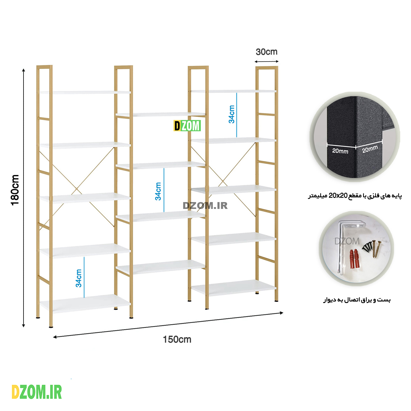 شلف دیواری دیزم DZom مدل SLF_D100_150_W محصولی سبک، شیک و در عین حال جذاب و کارآمد از سری تولیدات دیزم میباشد. مشتری گرامی توجه نمایید محصولات برند دیزم (شماره ثبت 414013 اداره ثبت علائم تجاری) با کیفیت و بسته بندی اصلی تنها توسط فروشنده رسمی دیزم در دیجی کالا عرضه می گردد، لطفا از خرید کالای تقلبی از سایر فروشندگان خودداری فرمایید. برند دیزم هیچگونه نمایندگی فروش در بازارهای فیزیکی و آنلاین نداشته و محصولات خود را مستقیما از طریق سایت Dzom.ir یا شبکه های اجتماعی خود به مصرف کننده (End User) عرضه می نماید. این محصول از پایه های فلزی با مقطع 20×20 میلیمتر و رنگ رویه الکترواستاتیک با ماندگاری و دوام بالا ساخته شده است. همچنین پایه های پیچی، قابلیت تنظیم نسبت به سطح زمین را دارد تا بهترین تراز جهت جلوگیری از تکان خوردن را ایجاد نماید. صفحه محصول از جنس MDF درجه یک برجسته طرح چوب و به رنگ سفید می باشد. این محصول با طول 150cm، عرض 30cm و ارتفاع 180cm عرضه می شود. به این نکته توجه شود که تنوع رنگ انتخابی کالا تنها مربوط به رنگ پایه های فلزی میباشد و محصول به صورت کاملا مونتاژ شده و آماده استفاده برای مشتریان ارسال می گردد. توصیه میشود جهت حفظ ایمنی و ثبات بیشتر، محصول در یک یا دو نقطه به دیوار پیچ گرد.(یراق اتصال داخل بسته بندی موجود است).