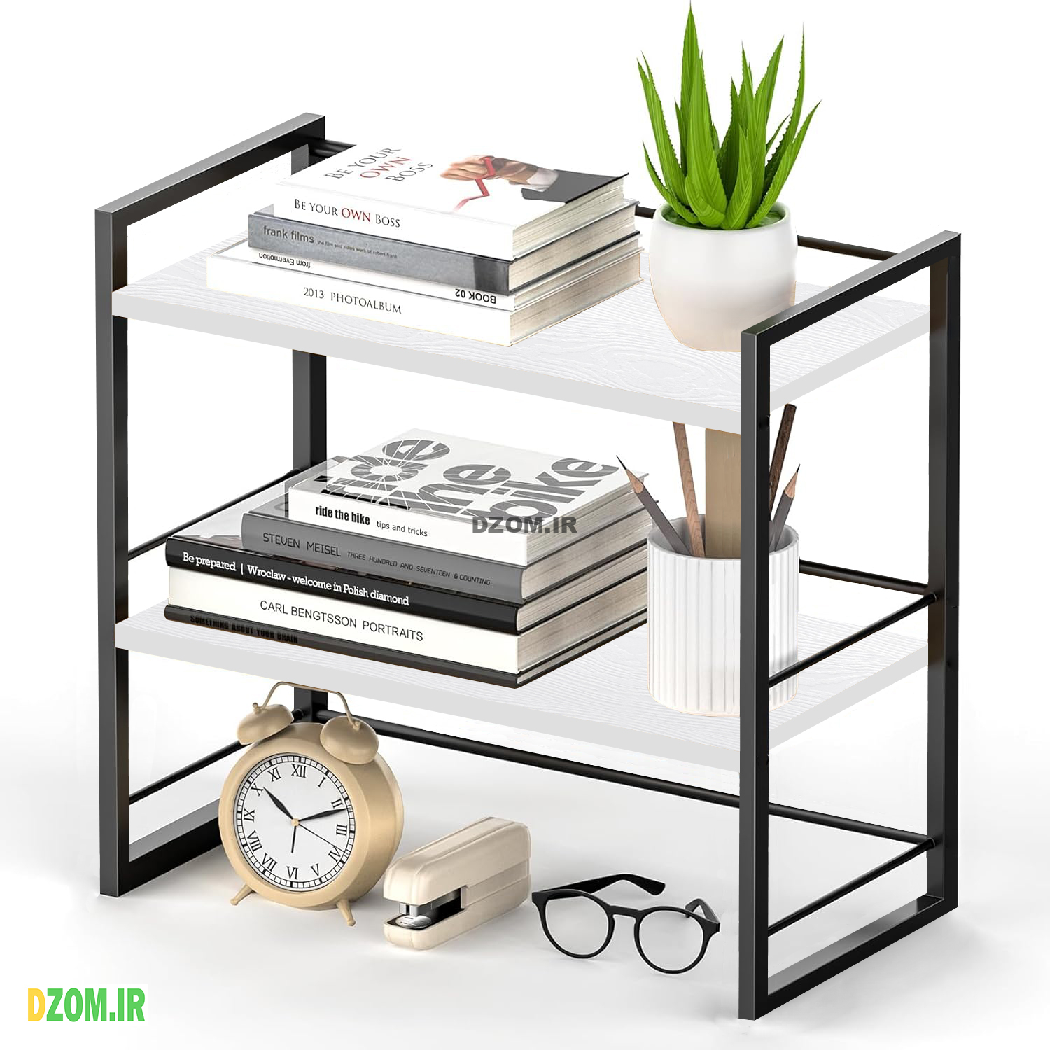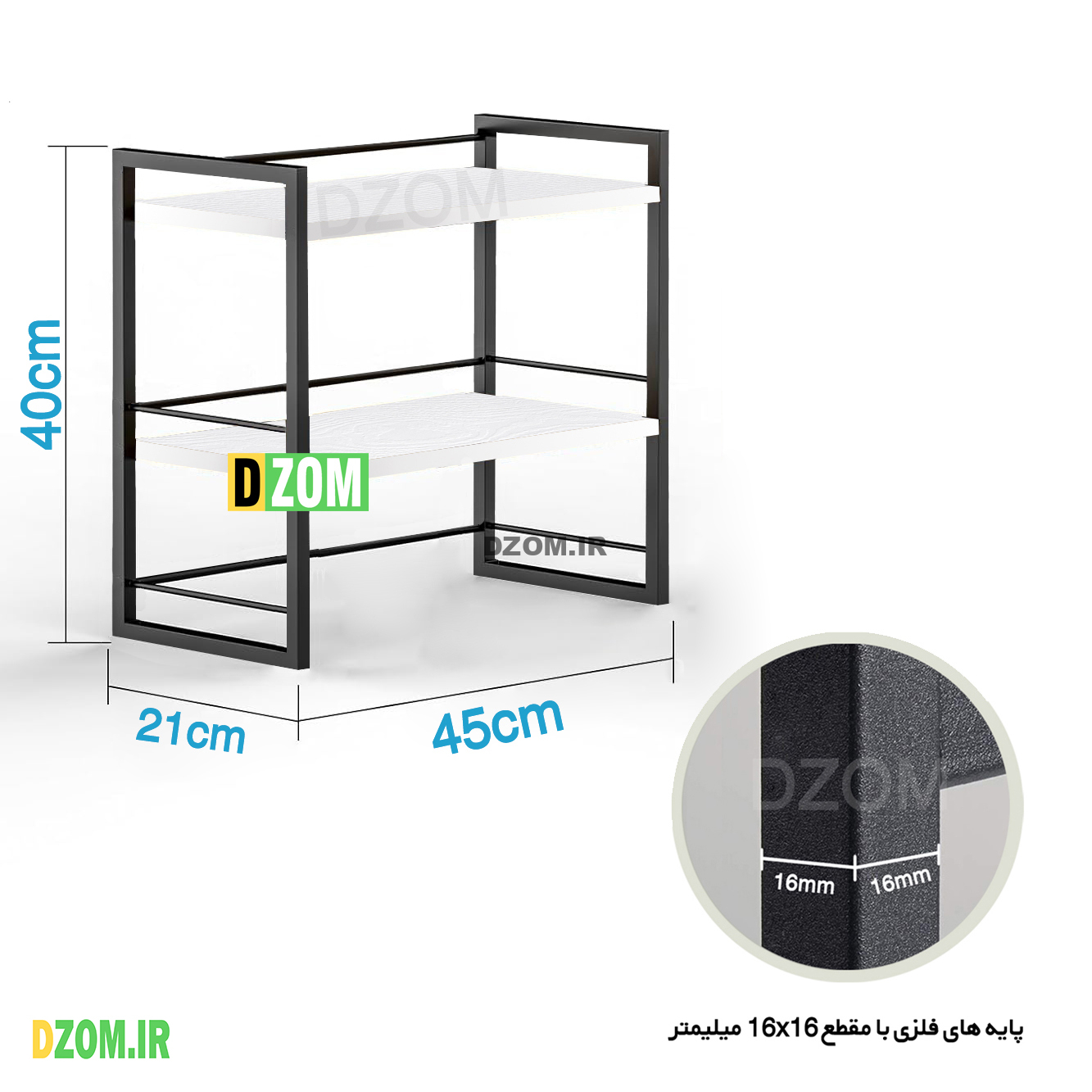 شلف دیزم DZom مدل SLF_12P17_45W محصولی سبک، شیک و در عین حال جذاب و کارآمد میباشد. مشتری گرامی توجه نمایید محصولات برند دیزم (شماره ثبت 414013 اداره ثبت علائم تجاری) با کیفیت و بسته بندی اصلی تنها توسط فروشنده رسمی دیزم در دیجی کالا عرضه می گردد، لطفا از خرید کالای تقلبی از سایر فروشندگان خودداری فرمایید. برند دیزم هیچگونه نمایندگی فروش در بازارهای فیزیکی و آنلاین نداشته و محصولات خود را مستقیما از طریق سایت Dzom.ir یا شبکه های اجتماعی خود به مصرف کننده (End User) عرضه می نماید. این محصول از پایه های فلزی با مقطع 16×16 میلیمتر و رنگ رویه الکترواستاتیک با ماندگاری و دوام بالا ساخته شده است و دارای پایه های لاستیکی می باشد. صفحه محصول از جنس MDF درجه یک برجسته طرح چوب و به رنگ سفید می باشد. این محصول با طول 45cm، عرض 21cm و ارتفاع 40cm عرضه می شود. به این نکته توجه شود که تنوع رنگ انتخابی کالا تنها مربوط به رنگ پایه های فلزی میباشد و محصول به صورت کاملا مونتاژ شده و آماده استفاده برای مشتریان ارسال می گردد.