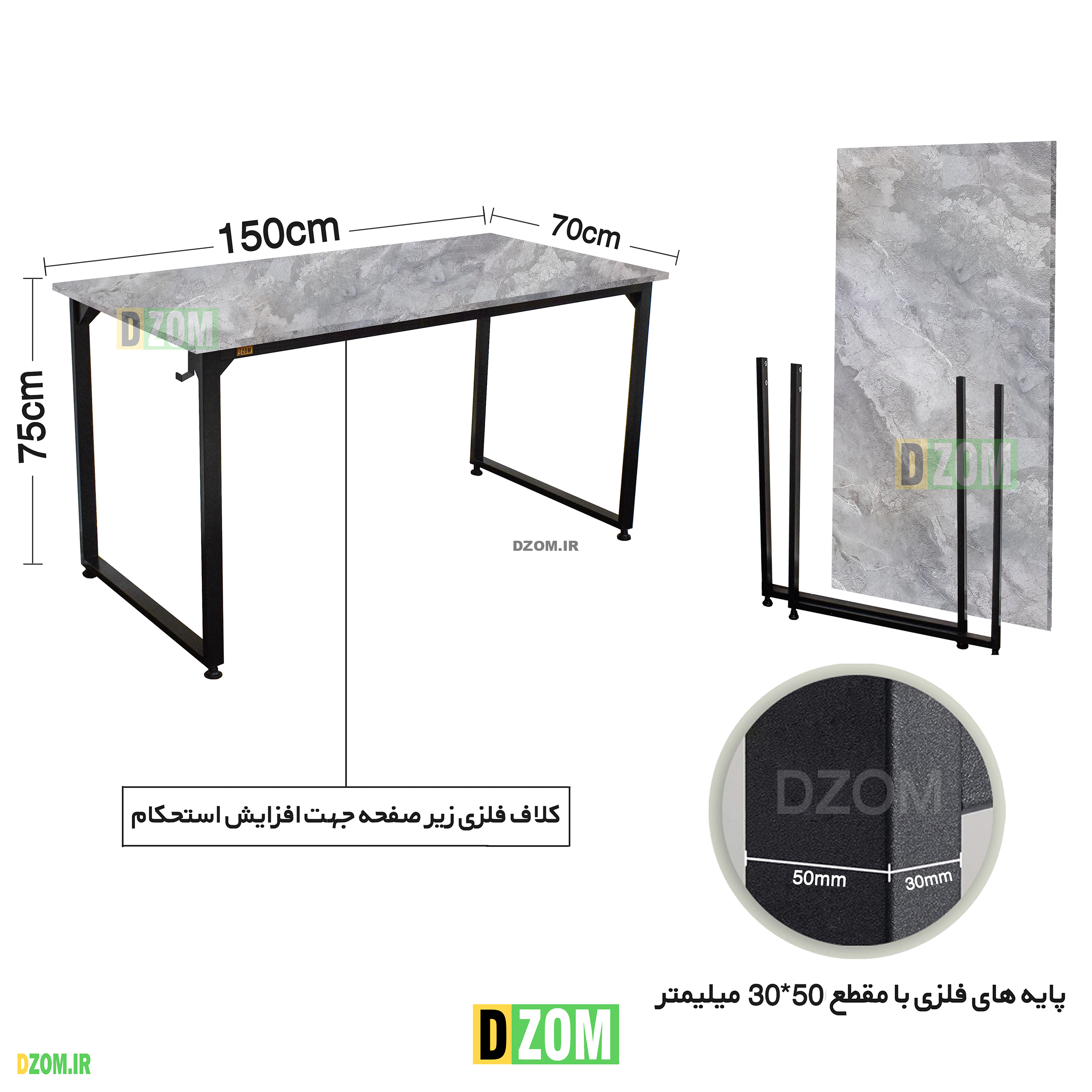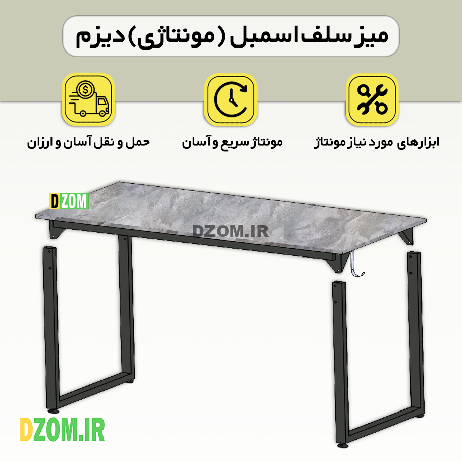 میز اداری دیزم DZom مدل مونتاژی TLD_asm_150×70_GR محصولی مونتاژی، سبک، شیک و در عین حال جذاب و کارآمد از سری تولیدات دیزم میباشد. مشتری گرامی توجه نمایید محصولات برند دیزم (شماره ثبت 414013 اداره ثبت علائم تجاری) با کیفیت و بسته بندی اصلی تنها توسط فروشنده رسمی دیزم در دیجی کالا عرضه می گردد، لطفا از خرید کالای تقلبی از سایر فروشندگان خودداری فرمایید. برند دیزم هیچگونه نمایندگی فروش در بازارهای فیزیکی و آنلاین نداشته و محصولات خود را مستقیما از طریق سایت Dzom.ir یا شبکه های اجتماعی خود به مصرف کننده (End User) عرضه می نماید. این محصول بصورت سلف اسمبل (مونتاژی) تولید شده است. این میز حمل و نقل آسان و هزینه حمل مقرون به صرفه ای دارد. این میز از پایه های فلزی با مقطع 50×30 میلیمتر و رنگ رویه الکترواستاتیک با ماندگاری و دوام بالا ساخته شده است. همچنین پایه های پیچی، قابلیت تنظیم نسبت به سطح زمین را دارد تا بهترین تراز جهت جلوگیری از تکان خوردن را ایجاد نماید. صفحه میز از جنس MDF درجه یک برجسته به رنگ طوسی می باشد. این محصول با طول 150cm، عرض 70cm و ارتفاع 75cm عرضه می شود. به این نکته توجه شود که تنوع رنگ انتخابی کالا تنها مربوط به رنگ پایه های فلزی میباشد.