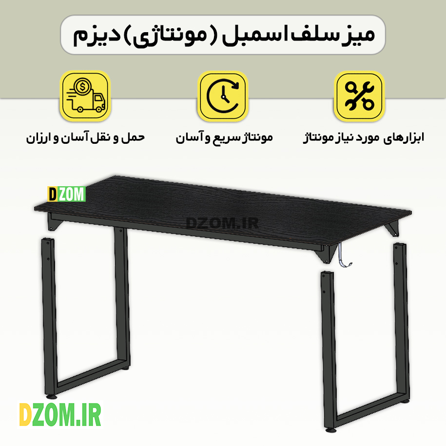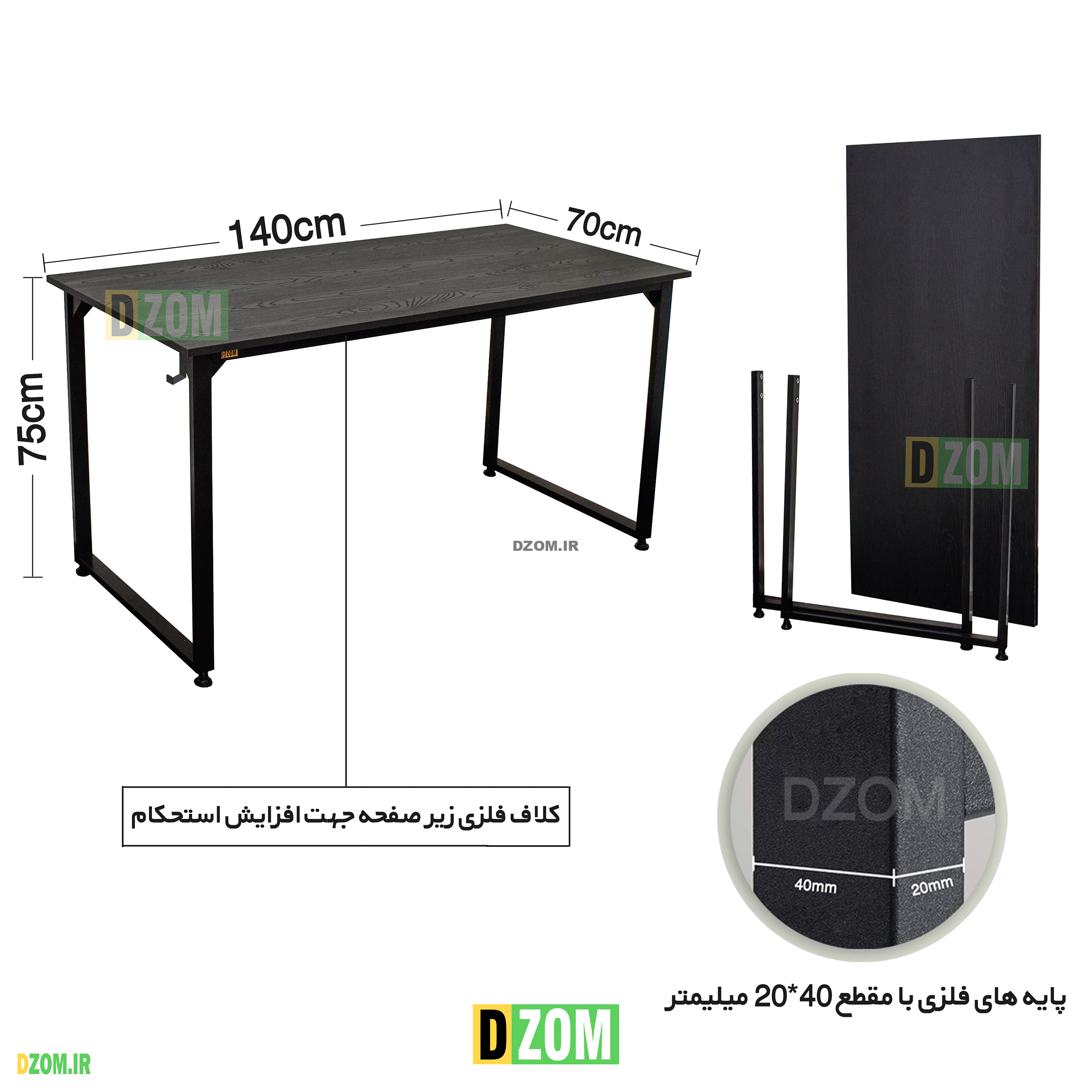 میز اداری دیزم DZom مدل مونتاژی TLD_asm_140×70_B محصولی مونتاژی، سبک، شیک و در عین حال جذاب و کارآمد از سری تولیدات دیزم میباشد. مشتری گرامی توجه نمایید محصولات برند دیزم (شماره ثبت 414013 اداره ثبت علائم تجاری) با کیفیت و بسته بندی اصلی تنها توسط فروشنده رسمی دیزم در دیجی کالا عرضه می گردد، لطفا از خرید کالای تقلبی از سایر فروشندگان خودداری فرمایید. برند دیزم هیچگونه نمایندگی فروش در بازارهای فیزیکی و آنلاین نداشته و محصولات خود را مستقیما از طریق سایت Dzom.ir یا شبکه های اجتماعی خود به مصرف کننده (End User) عرضه می نماید. این محصول بصورت سلف اسمبل (مونتاژی) تولید شده است. ویژگی ممتاز این میز حمل و نقل آسان آن است. سلف اسمبل بودن محصول باعث شده است تا هزینه حمل و نقل بسیار مناسب و مقرون به صرفه شود. این میز از پایه های فلزی با مقطع 40×20 میلیمتر و رنگ رویه الکترواستاتیک با ماندگاری و دوام بالا ساخته شده است. همچنین پایه های پیچی، قابلیت تنظیم نسبت به سطح زمین را دارد تا بهترین تراز جهت جلوگیری از تکان خوردن را ایجاد نماید. صفحه میز از جنس MDF درجه یک برجسته طرح چوب به رنگ مشکی می باشد. این محصول با طول 140cm، عرض 70cm و ارتفاع 75cm عرضه می شود. به این نکته توجه شود که تنوع رنگ انتخابی کالا تنها مربوط به رنگ پایه های فلزی میباشد.