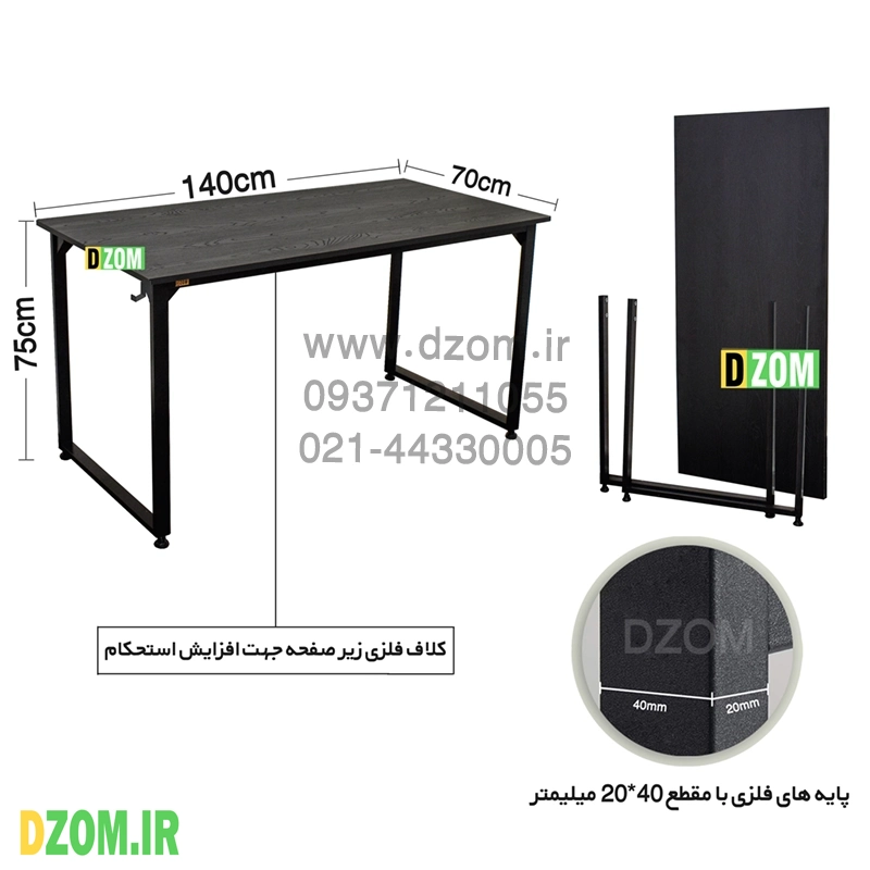 میز اداری دیزم DZom مدل مونتاژی TLD_asm_140×70_B محصولی مونتاژی، سبک، شیک و در عین حال جذاب و کارآمد از سری تولیدات دیزم میباشد. مشتری گرامی توجه نمایید برند دیزم (شماره ثبت 414013 اداره ثبت علائم تجاری) هیچگونه نمایندگی فروش در بازارهای فیزیکی و آنلاین نداشته و محصولات خود را با کیفیت و بسته بندی اصلی، مستقیما از طریق سایت Dzom.ir یا شبکه های اجتماعی خود به مصرف کننده (End User) عرضه می نماید. لطفا از خرید کالای تقلبی از سایر فروشندگان خودداری فرمایید. این محصول بصورت سلف اسمبل (مونتاژی) تولید شده است. ویژگی ممتاز این میز حمل و نقل آسان آن است. سلف اسمبل بودن محصول باعث شده است تا هزینه حمل و نقل بسیار مناسب و مقرون به صرفه شود. این میز از پایه های فلزی با مقطع 40×20 میلیمتر و رنگ رویه الکترواستاتیک با ماندگاری و دوام بالا ساخته شده است. همچنین پایه های پیچی، قابلیت تنظیم نسبت به سطح زمین را دارد تا بهترین تراز جهت جلوگیری از تکان خوردن را ایجاد نماید. صفحه میز از جنس MDF درجه یک برجسته طرح چوب به رنگ مشکی می باشد. این محصول با طول 140cm، عرض 70cm و ارتفاع 75cm عرضه می شود. به این نکته توجه شود که تنوع رنگ انتخابی کالا تنها مربوط به رنگ پایه های فلزی میباشد.