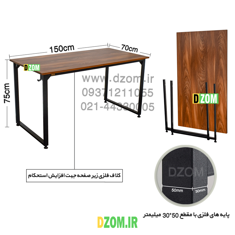 میز اداری دیزم DZom مدل مونتاژی TLD_asm_150×70_BRN محصولی مونتاژی، سبک، شیک و در عین حال جذاب و کارآمد از سری تولیدات دیزم میباشد. مشتری گرامی توجه نمایید برند دیزم (شماره ثبت 414013 اداره ثبت علائم تجاری) هیچگونه نمایندگی فروش در بازارهای فیزیکی و آنلاین نداشته و محصولات خود را با کیفیت و بسته بندی اصلی، مستقیما از طریق سایت Dzom.ir یا شبکه های اجتماعی خود به مصرف کننده (End User) عرضه می نماید. لطفا از خرید کالای تقلبی از سایر فروشندگان خودداری فرمایید. این محصول بصورت سلف اسمبل (مونتاژی) تولید شده است. این میز حمل و نقل آسان و هزینه حمل مقرون به صرفه ای دارد. این میز از پایه های فلزی با مقطع 50×30 میلیمتر و رنگ رویه الکترواستاتیک با ماندگاری و دوام بالا ساخته شده است. همچنین پایه های پیچی، قابلیت تنظیم نسبت به سطح زمین را دارد تا بهترین تراز جهت جلوگیری از تکان خوردن را ایجاد نماید. صفحه میز از جنس MDF درجه یک برجسته طرح چوب به رنگ قهوه ای می باشد. این محصول با طول 150cm، عرض 70cm و ارتفاع 75cm عرضه می شود. به این نکته توجه شود که تنوع رنگ انتخابی کالا تنها مربوط به رنگ پایه های فلزی میباشد.