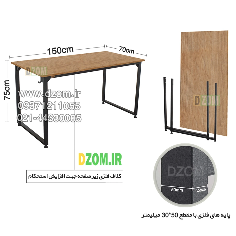 میز اداری دیزم DZom مدل مونتاژی TLD_asm_150×70_LIGHT محصولی مونتاژی، سبک، شیک و در عین حال جذاب و کارآمد از سری تولیدات دیزم میباشد. مشتری گرامی توجه نمایید برند دیزم (شماره ثبت 414013 اداره ثبت علائم تجاری) هیچگونه نمایندگی فروش در بازارهای فیزیکی و آنلاین نداشته و محصولات خود را با کیفیت و بسته بندی اصلی، مستقیما از طریق سایت Dzom.ir یا شبکه های اجتماعی خود به مصرف کننده (End User) عرضه می نماید. لطفا از خرید کالای تقلبی از سایر فروشندگان خودداری فرمایید. این محصول بصورت سلف اسمبل (مونتاژی) تولید شده است. این میز حمل و نقل آسان و هزینه حمل مقرون به صرفه ای دارد. این میز از پایه های فلزی با مقطع 50×30 میلیمتر و رنگ رویه الکترواستاتیک با ماندگاری و دوام بالا ساخته شده است. همچنین پایه های پیچی، قابلیت تنظیم نسبت به سطح زمین را دارد تا بهترین تراز جهت جلوگیری از تکان خوردن را ایجاد نماید. صفحه میز از جنس MDF درجه یک برجسته طرح چوب به رنگ قهوه ای روشن می باشد. این محصول با طول 150cm، عرض 70cm و ارتفاع 75cm عرضه می شود. به این نکته توجه شود که تنوع رنگ انتخابی کالا تنها مربوط به رنگ پایه های فلزی میباشد.