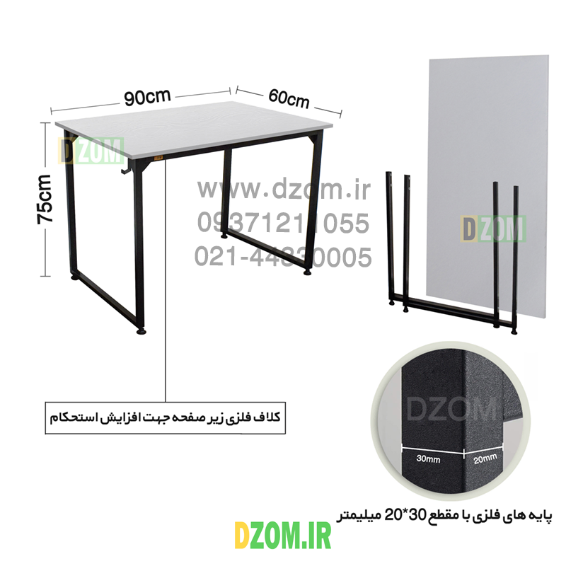 میز لپ تاپ دیزم DZom مدل مونتاژی TLD_asm_90×60_W محصولی مونتاژی، سبک، شیک و در عین حال جذاب و کارآمد از سری تولیدات دیزم میباشد. مشتری گرامی توجه نمایید برند دیزم (شماره ثبت 414013 اداره ثبت علائم تجاری) هیچگونه نمایندگی فروش در بازارهای فیزیکی و آنلاین نداشته و محصولات خود را با کیفیت و بسته بندی اصلی، مستقیما از طریق سایت Dzom.ir یا شبکه های اجتماعی خود به مصرف کننده (End User) عرضه می نماید. لطفا از خرید کالای تقلبی از سایر فروشندگان خودداری فرمایید. این محصول بصورت سلف اسمبل (مونتاژی) تولید شده است. این میز حمل و نقل آسان و هزینه حمل مقرون به صرفه ای دارد. این میز از پایه های فلزی با مقطع 30×20 میلیمتر و رنگ رویه الکترواستاتیک با ماندگاری و دوام بالا ساخته شده است. همچنین پایه های پیچی، قابلیت تنظیم نسبت به سطح زمین را دارد تا بهترین تراز جهت جلوگیری از تکان خوردن را ایجاد نماید. صفحه میز از جنس MDF درجه یک برجسته طرح چوب و به رنگ سفید می باشد. این محصول با طول 90cm، عرض 60cm و ارتفاع 75cm عرضه می شود. به این نکته توجه شود که تنوع رنگ انتخابی کالا تنها مربوط به رنگ پایه های فلزی میباشد.
