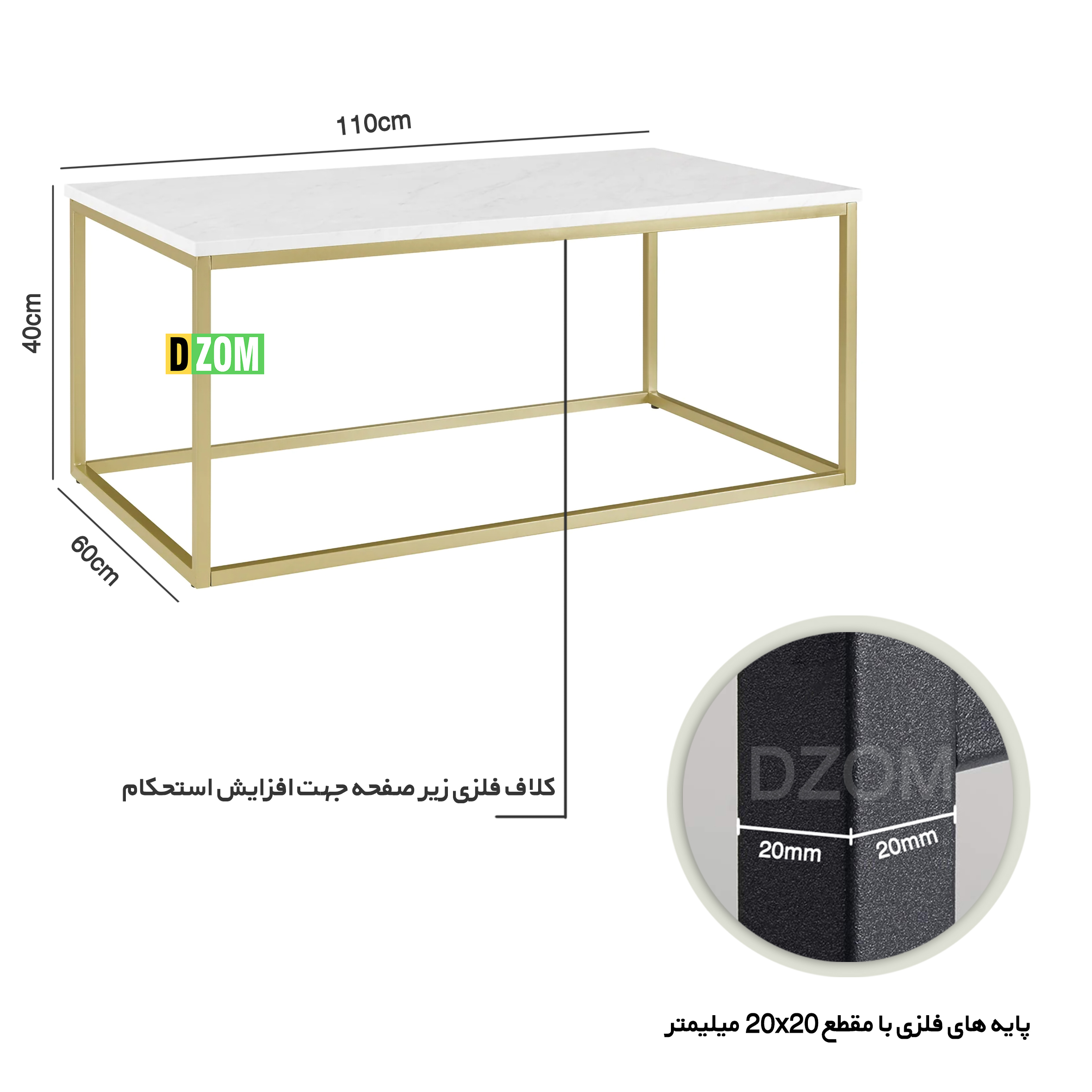 میز جلومبلی اداری دیزم DZom مدل OF_A100_110_SW محصولی سبک، شیک و در عین حال جذاب و کارآمد از سری تولیدات دیزم میباشد. مشتری گرامی توجه نمایید محصولات برند دیزم (شماره ثبت 414013 اداره ثبت علائم تجاری) با کیفیت و بسته بندی اصلی تنها توسط فروشنده رسمی دیزم در دیجی کالا عرضه می گردد، لطفا از خرید کالای تقلبی از سایر فروشندگان خودداری فرمایید. برند دیزم هیچگونه نمایندگی فروش در بازارهای فیزیکی و آنلاین نداشته و محصولات خود را مستقیما از طریق سایت Dzom.ir یا شبکه های اجتماعی خود به مصرف کننده (End User) عرضه می نماید. این محصول از پایه های فلزی با مقطع 20×20 میلیمتر و رنگ رویه الکترواستاتیک با ماندگاری و دوام بالا ساخته شده است و دارای پایه های لاستیکی می باشد. صفحه محصول از جنس MDF درجه یک طرح سنگ و به رنگ سفید می باشد. این محصول با طول 110cm، عرض 60cm و ارتفاع 40cm عرضه می شود. به این نکته توجه شود که تنوع رنگ انتخابی کالا تنها مربوط به رنگ پایه های فلزی میباشد و محصول به صورت کاملا مونتاژ شده و آماده استفاده برای مشتریان ارسال می گردد.